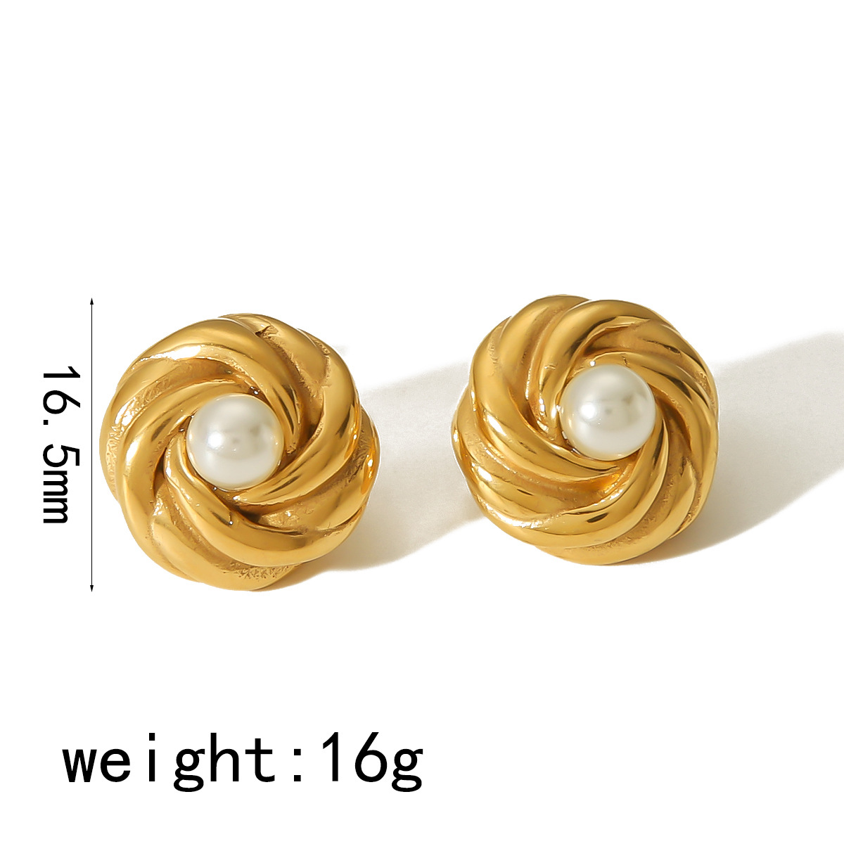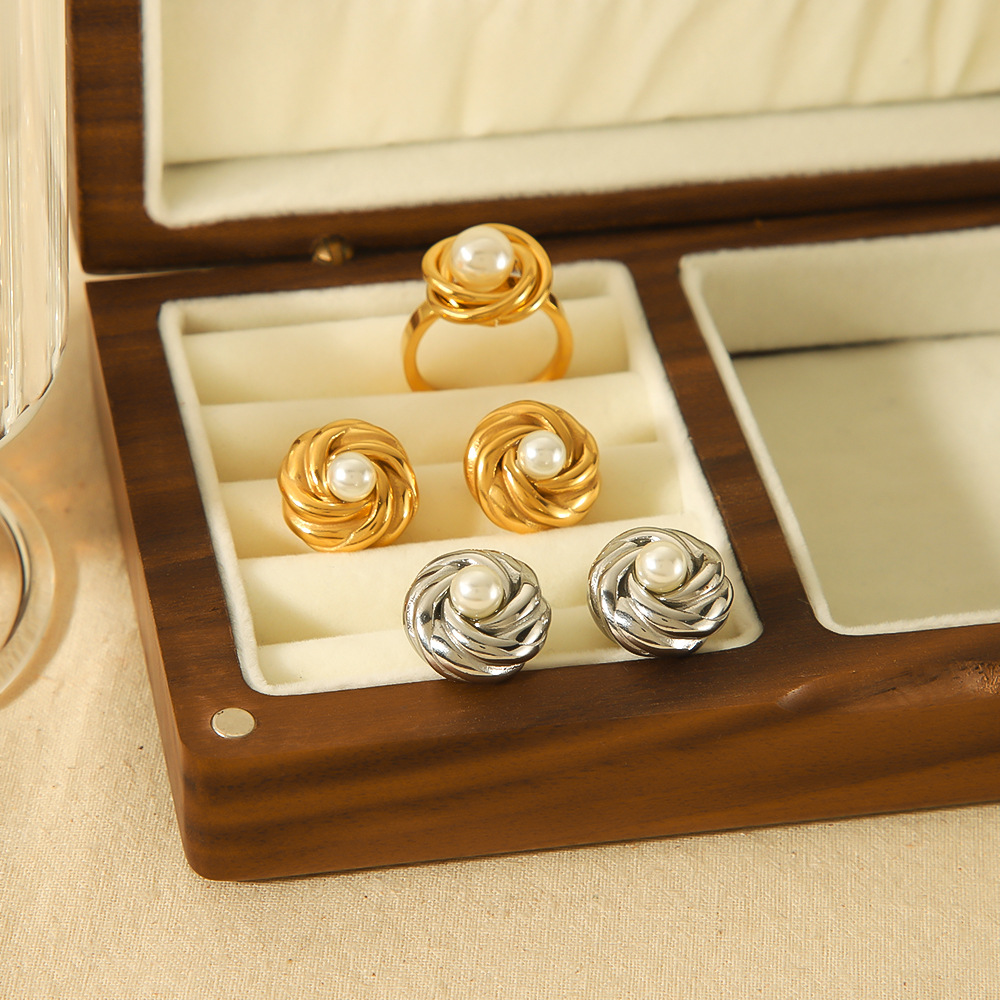 18k金螺纹花朵珍珠耳环女士轻奢高级感ins小众不锈钢耳钉耳饰批发