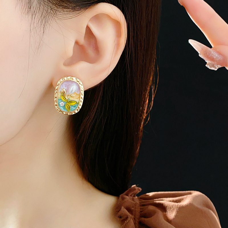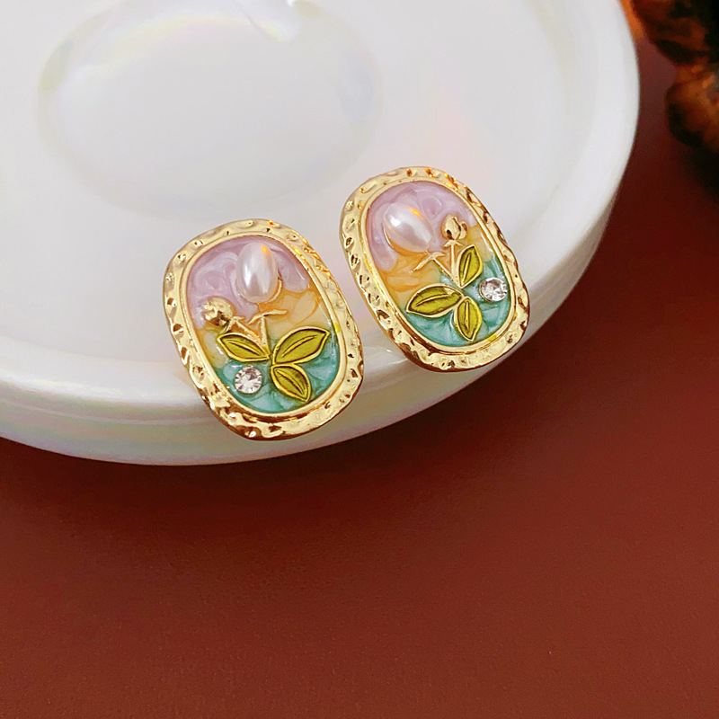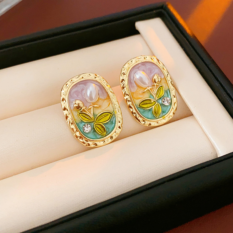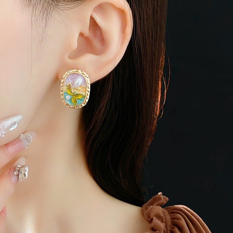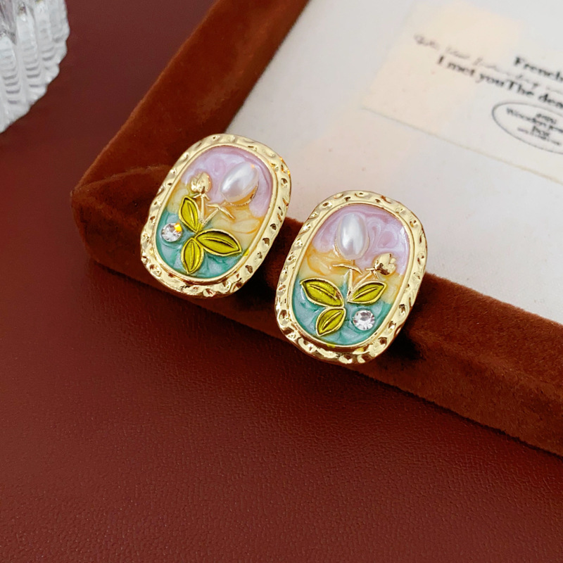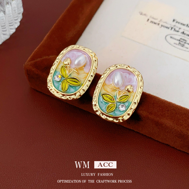 中古vintage耳环银针椭圆形滴油花朵珍珠镶钻耳钉轻奢高级感耳饰