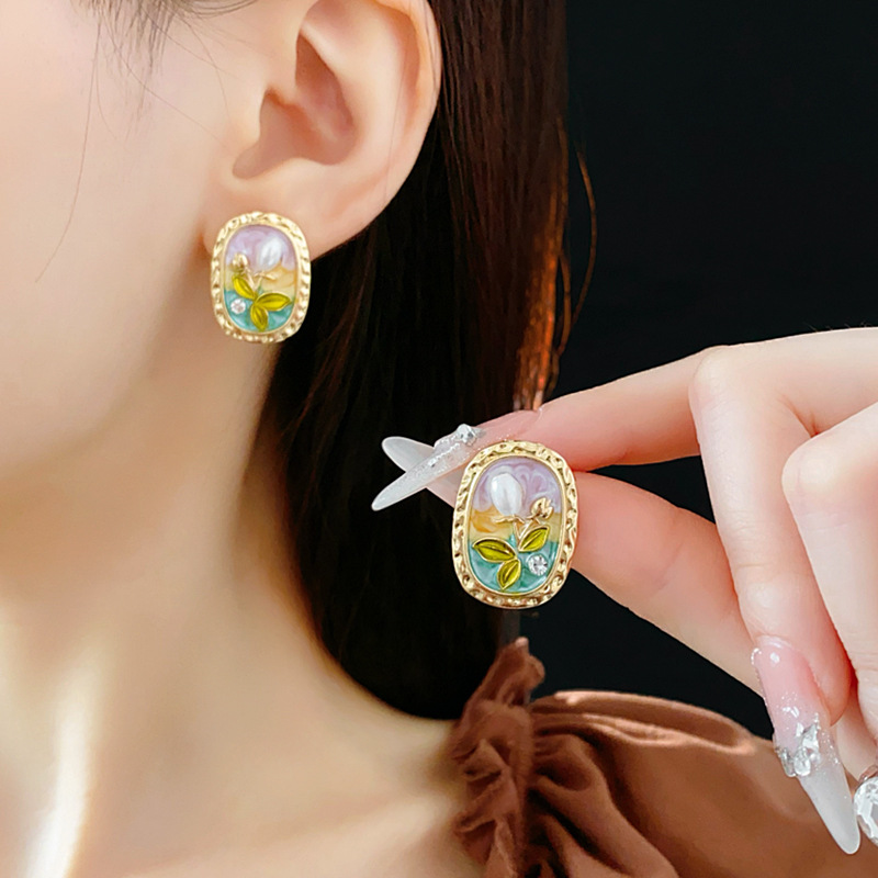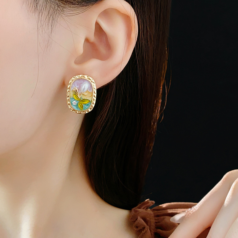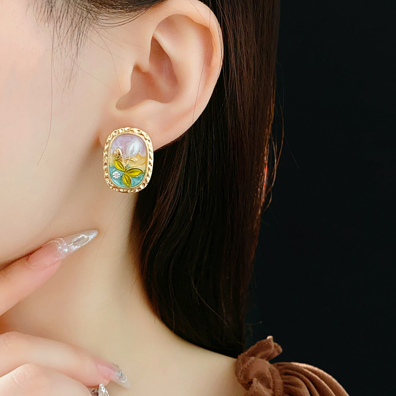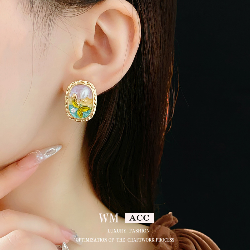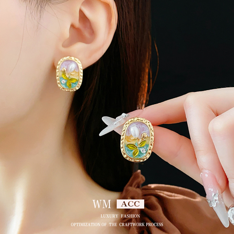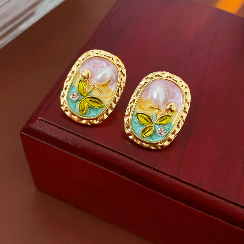 中古vintage耳环银针椭圆形滴油花朵珍珠镶钻耳钉轻奢高级感耳饰
