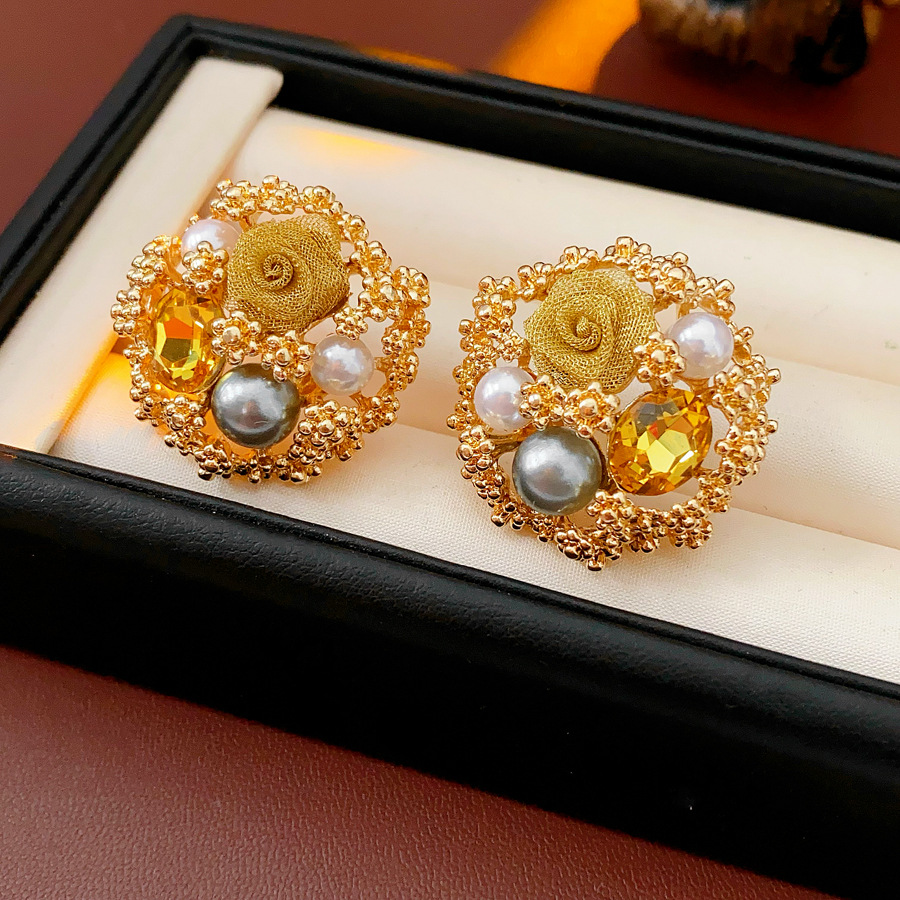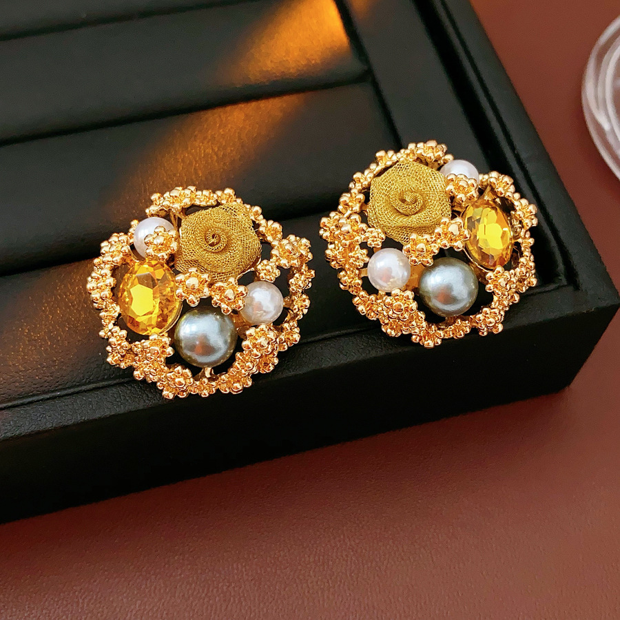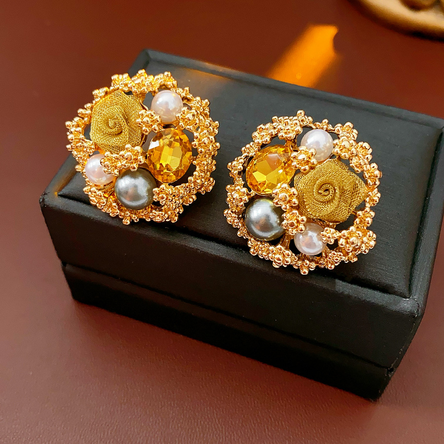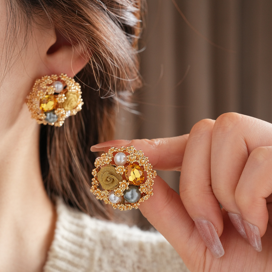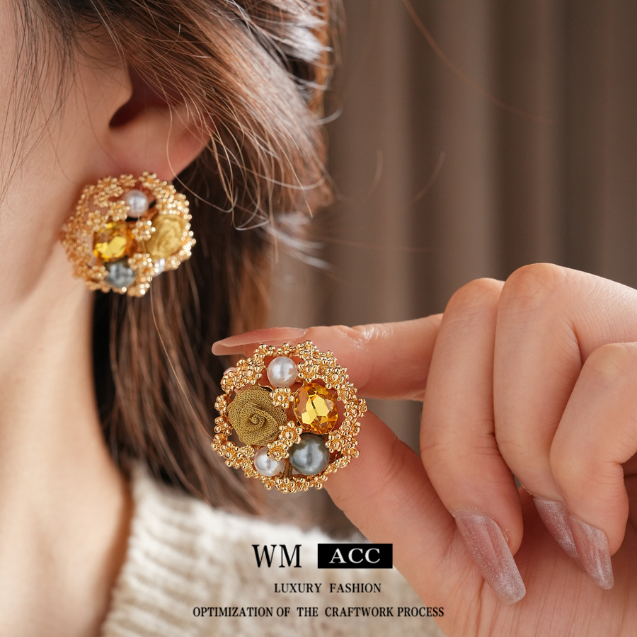 中古vintage轻奢时尚耳环银针镶钻花朵珍珠耳钉高级感复古耳饰女