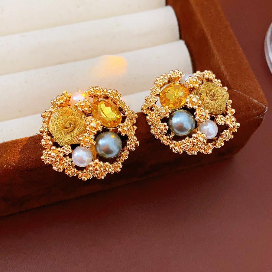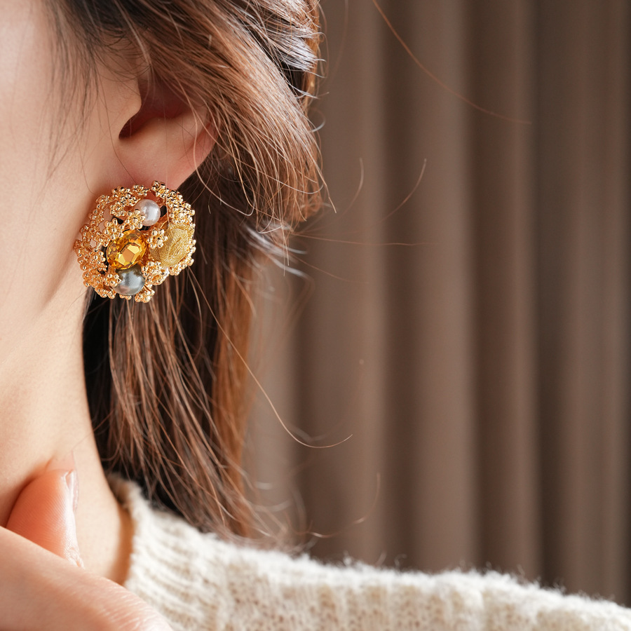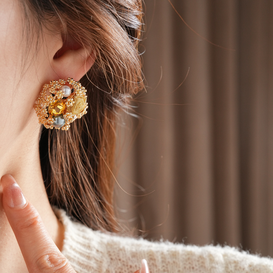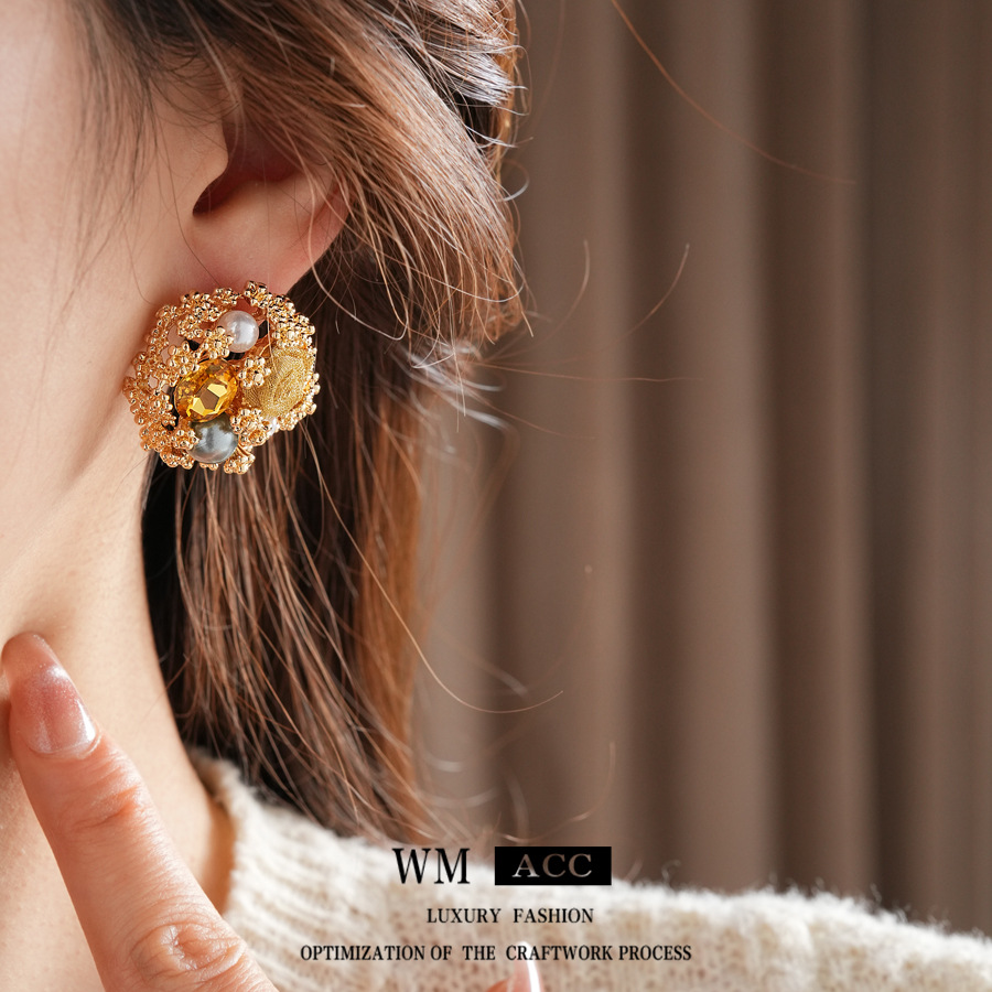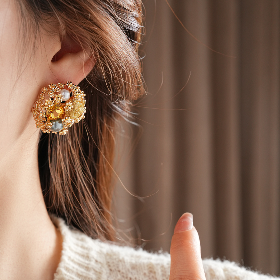 中古vintage轻奢时尚耳环银针镶钻花朵珍珠耳钉高级感复古耳饰女