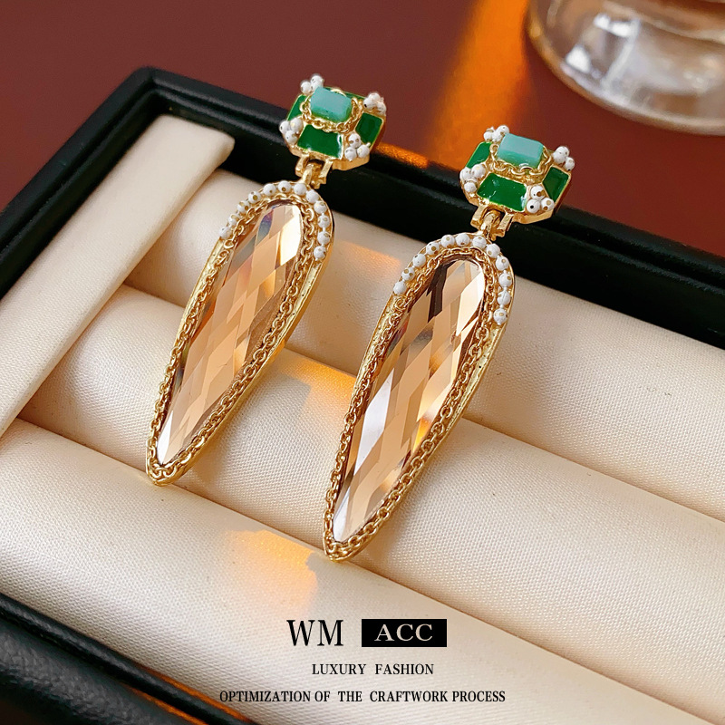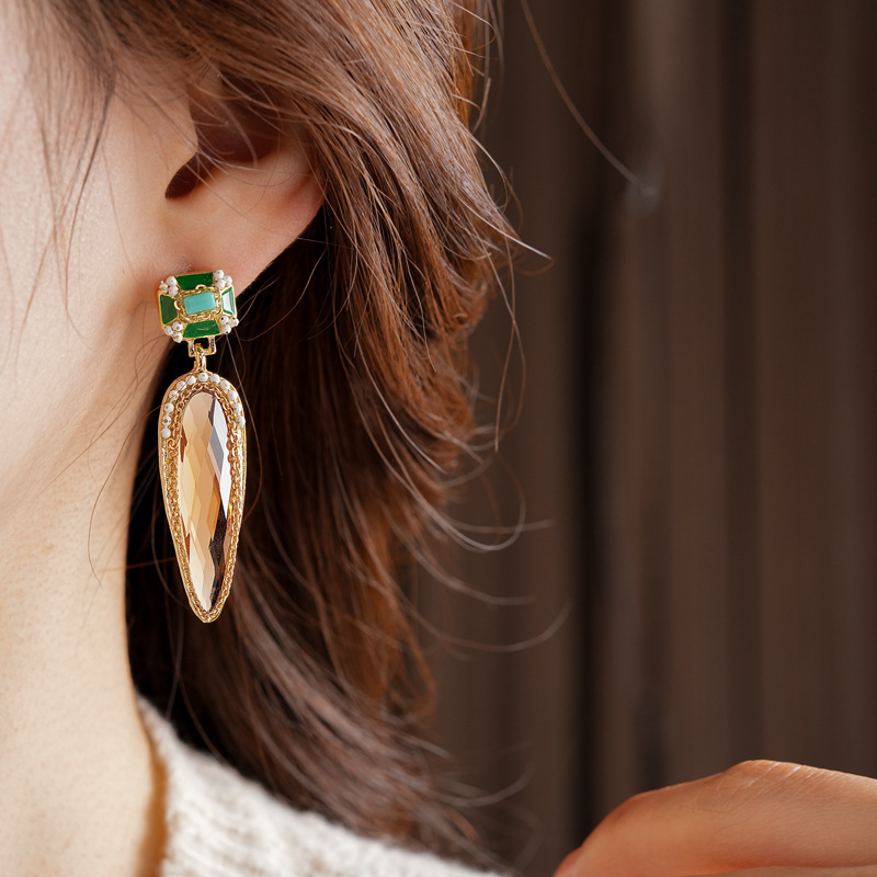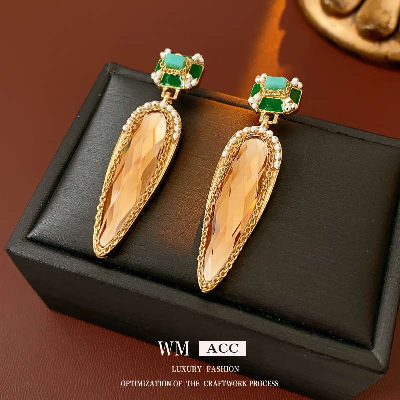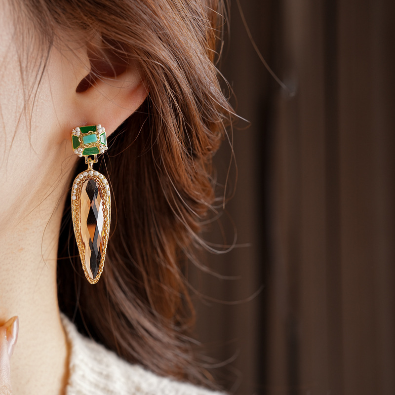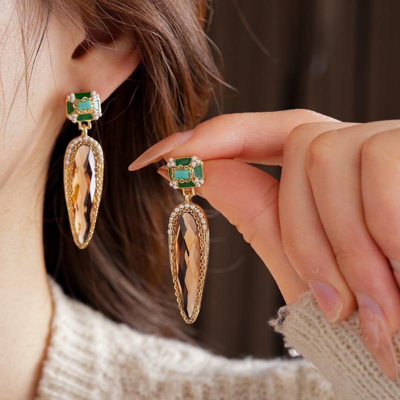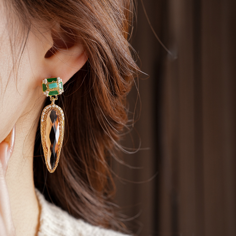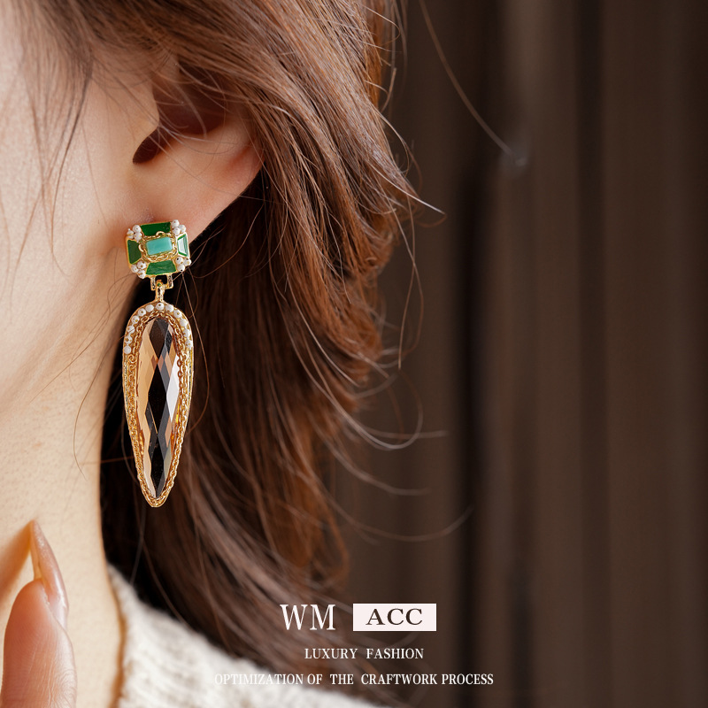 中古vintage水滴耳环银针镶钻滴油方形耳坠高级感复古夸张耳饰女