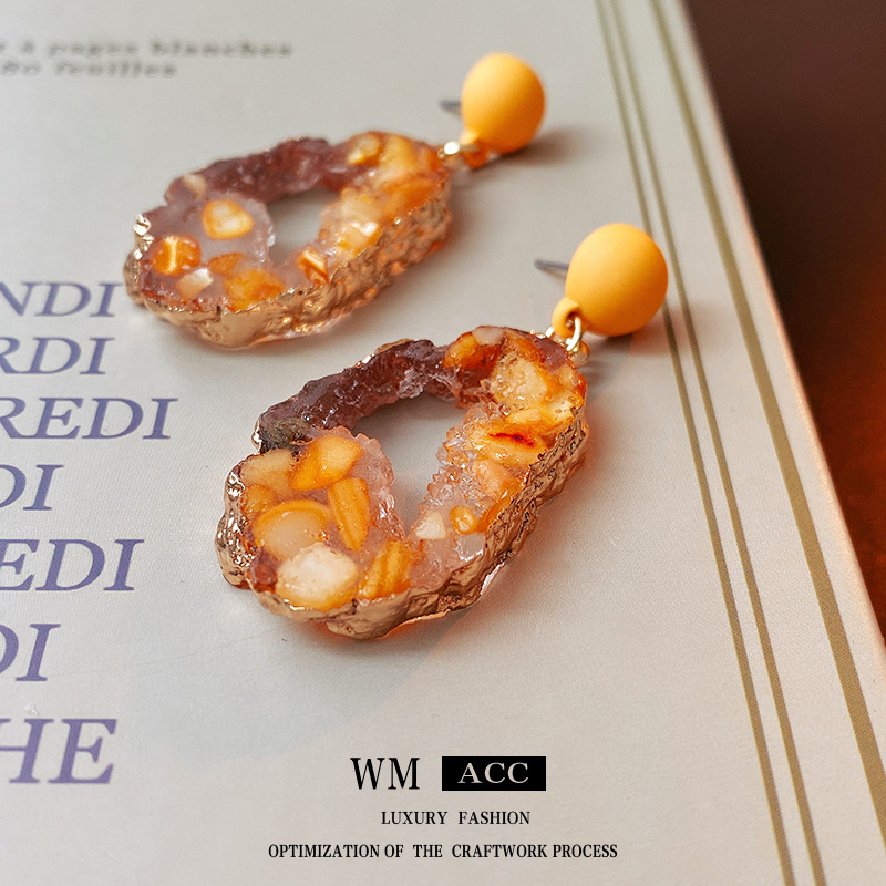 中古vintage银针耳环黄色镂空椭圆耳钉时尚百搭高级感气质耳饰女