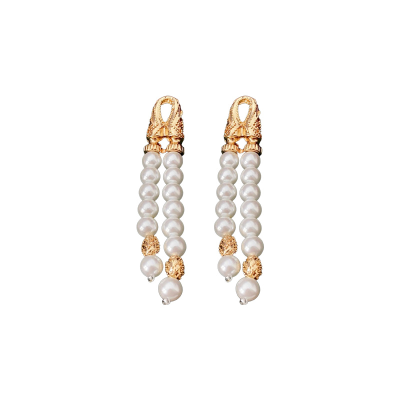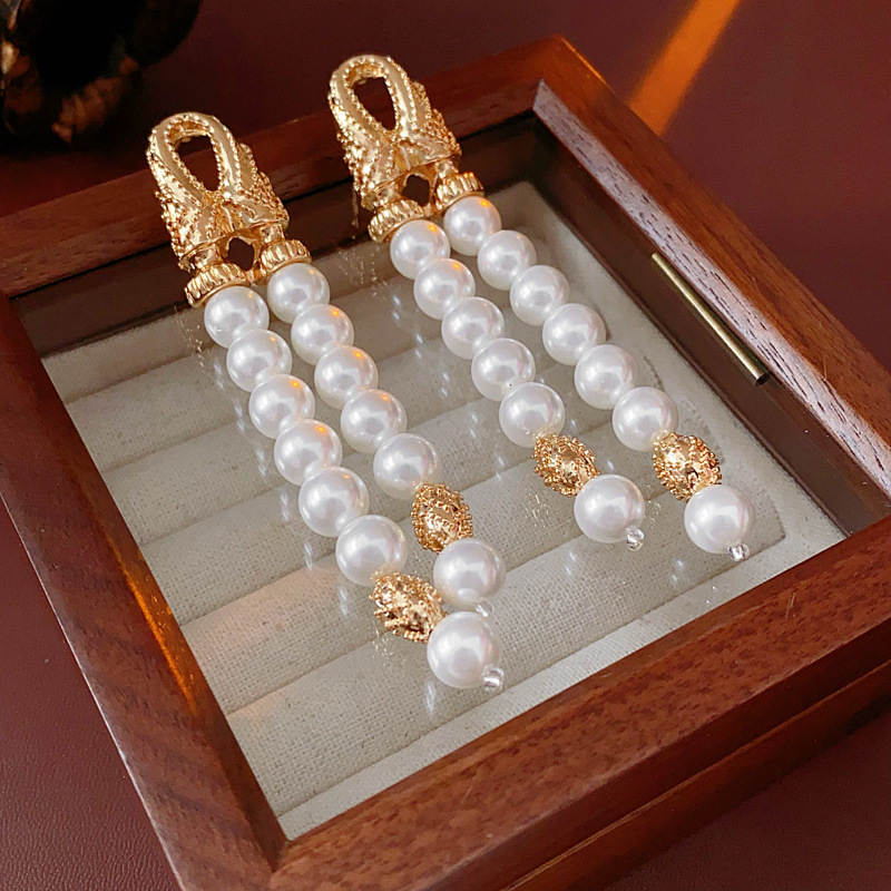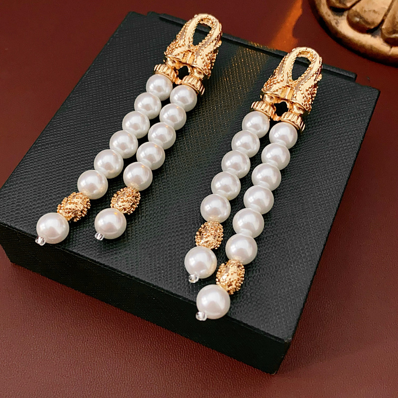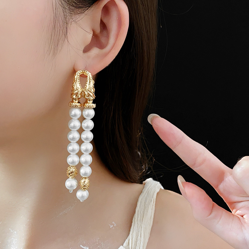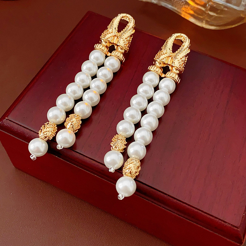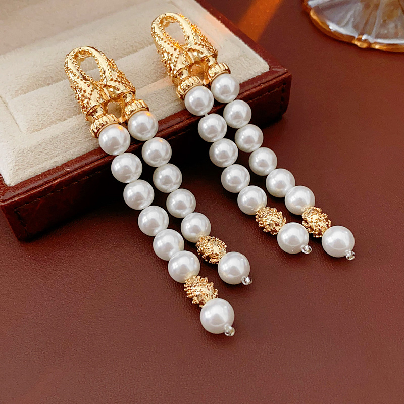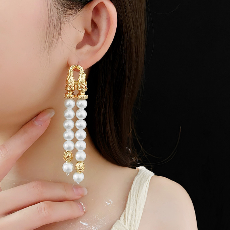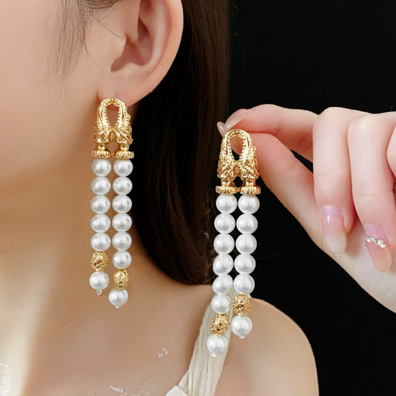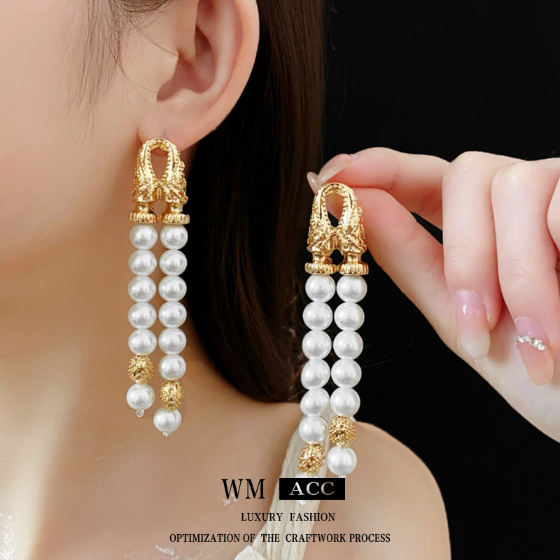 中古vintage银针耳环几何双层人造珍珠款流苏耳钉轻奢高级感耳饰