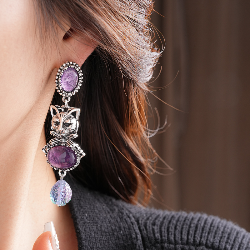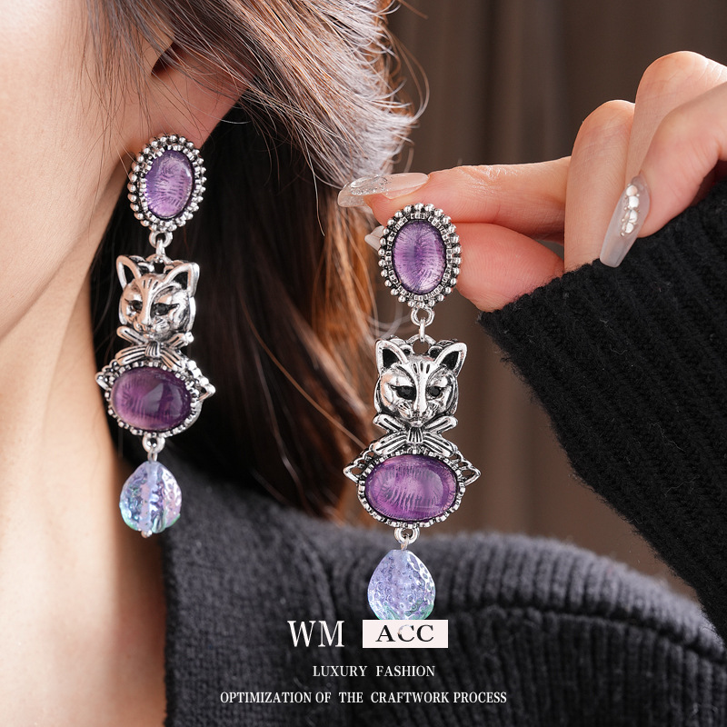 中古vintage镶钻耳环银针小猫椭圆形耳钉百搭高级感重工夸张耳饰