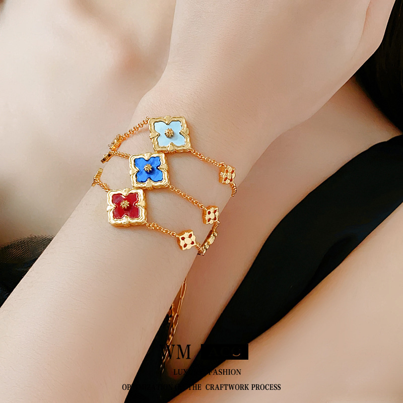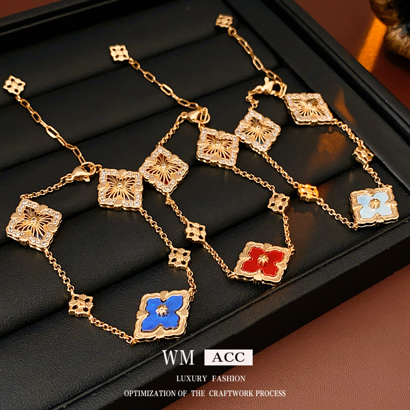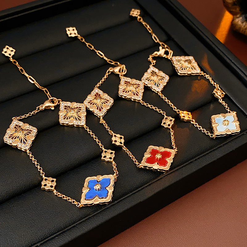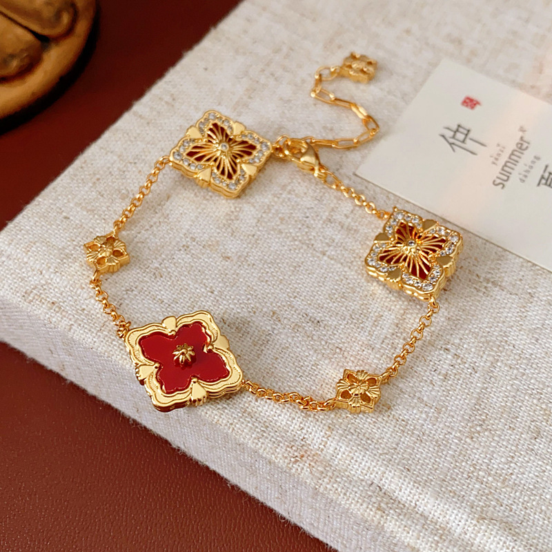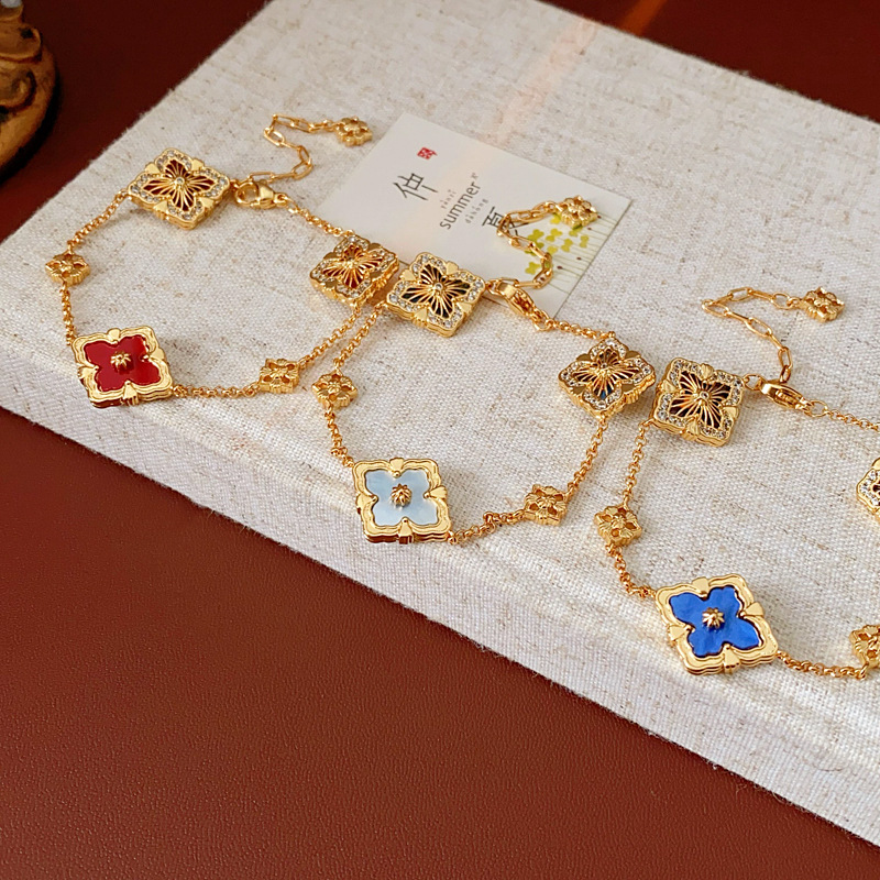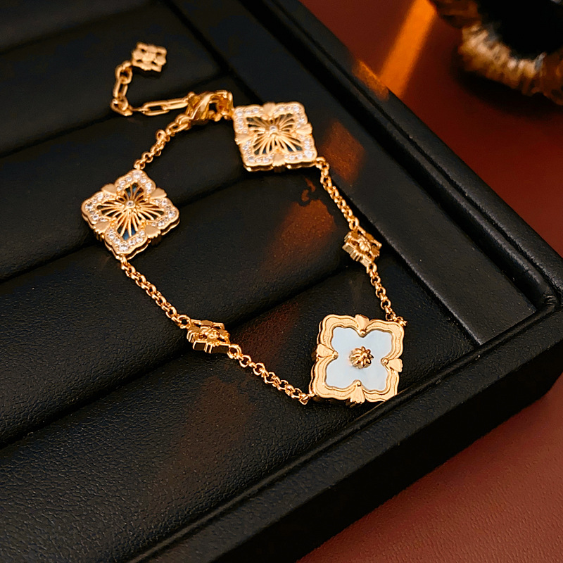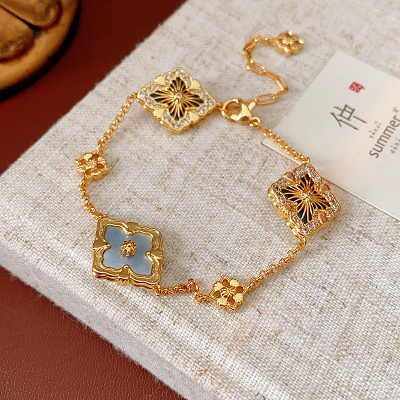 中古vintage真金电镀菱形花朵手链贝母锆石可调节手环高级感手饰