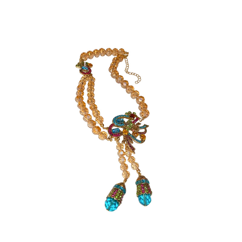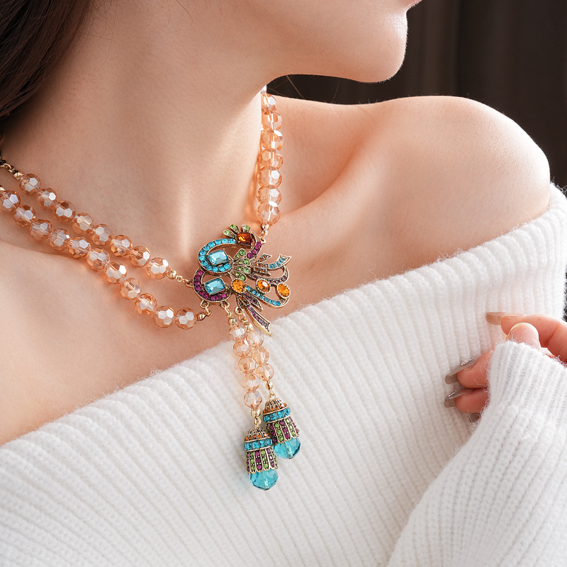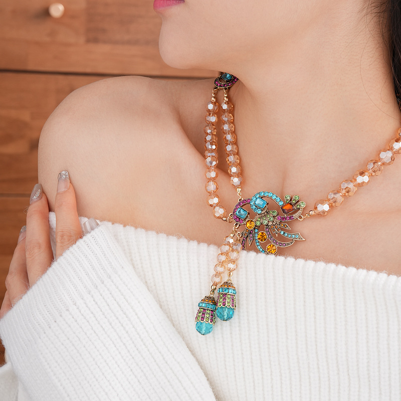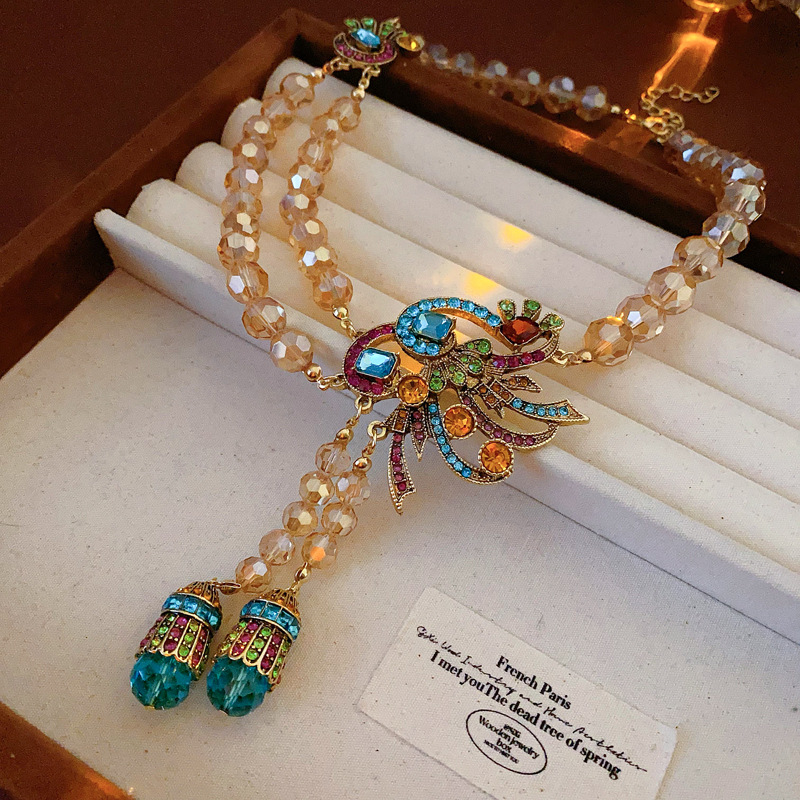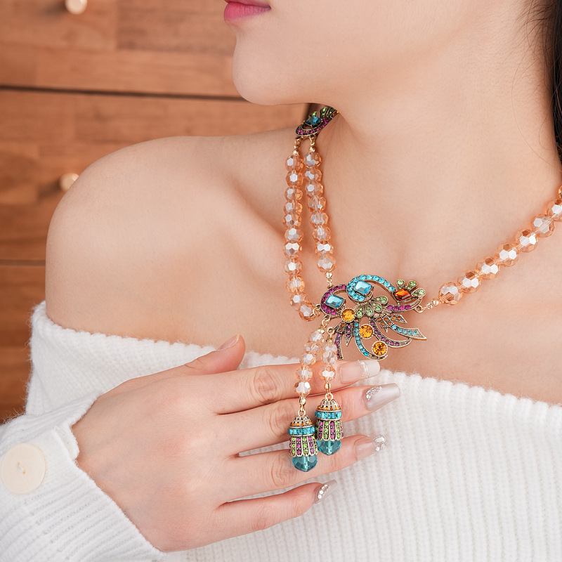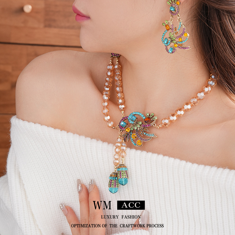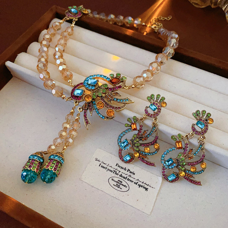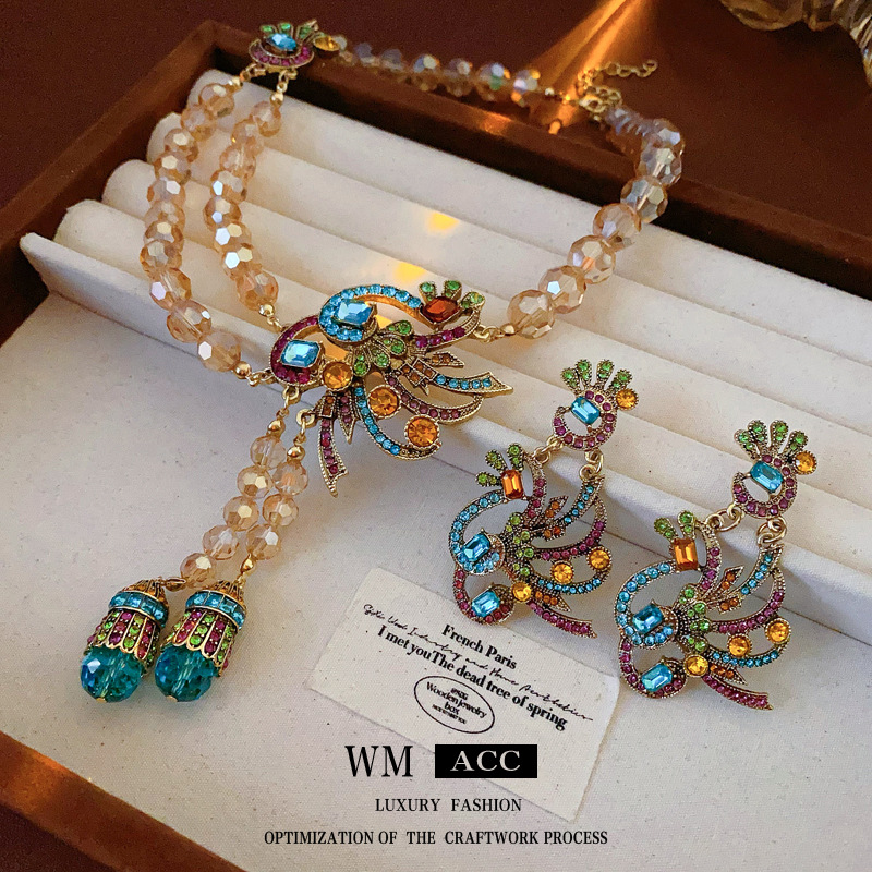 中古vintage镶钻套装银针孔雀花朵耳环小众复古轻奢高级感项链女