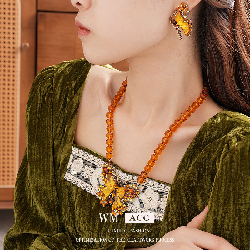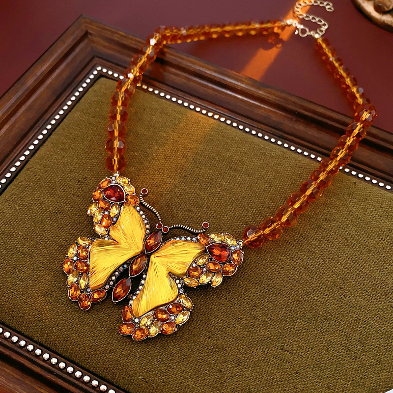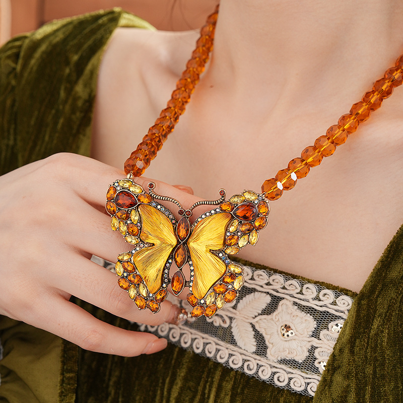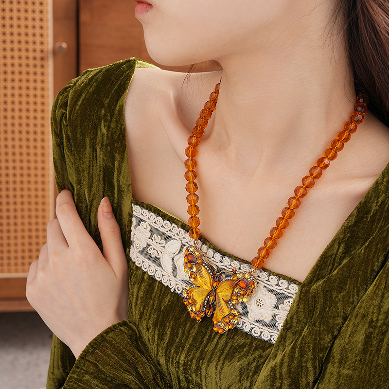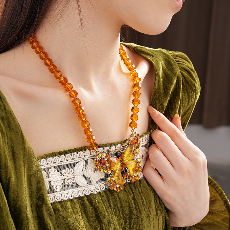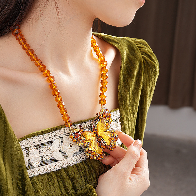 中古vintage项链秋冬镶钻蝴蝶串珠气质设计毛衣链复古高级感项饰