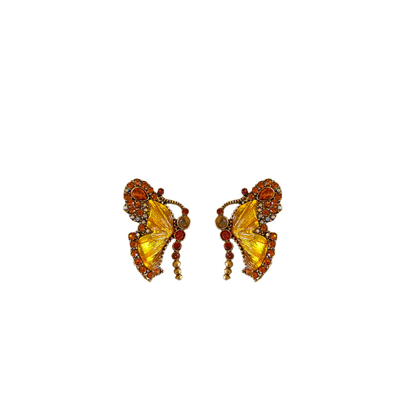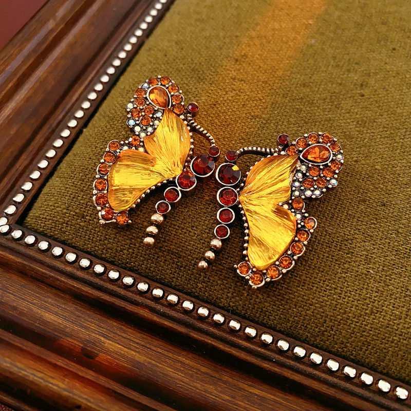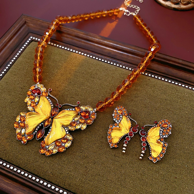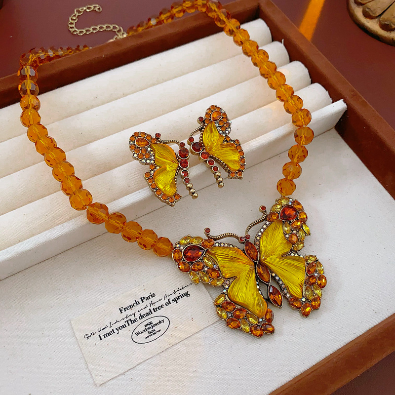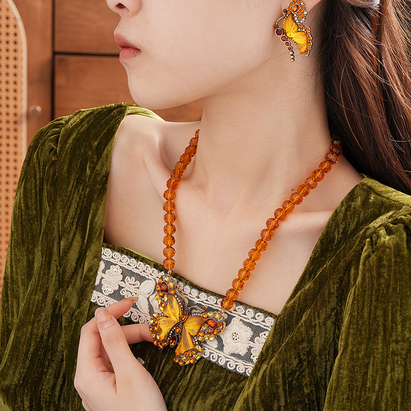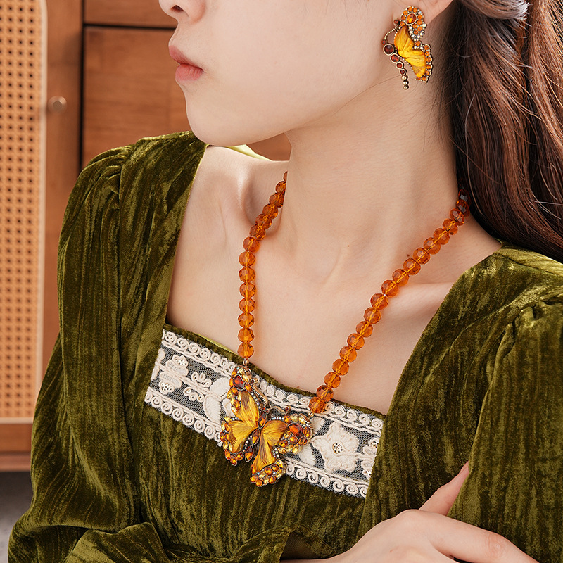 中古vintage项链秋冬镶钻蝴蝶串珠气质设计毛衣链复古高级感项饰