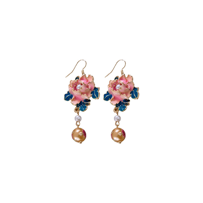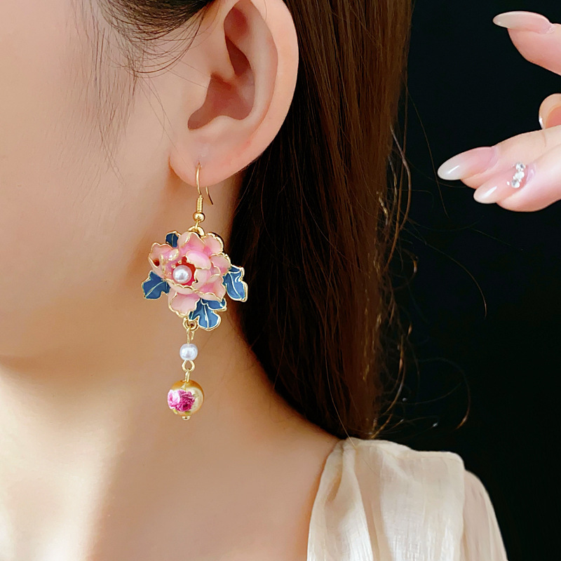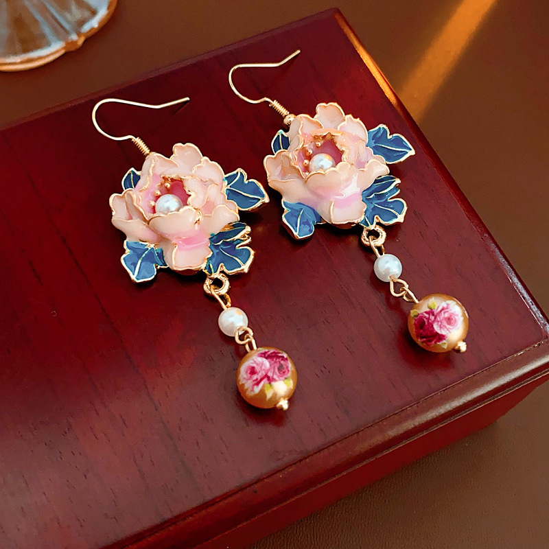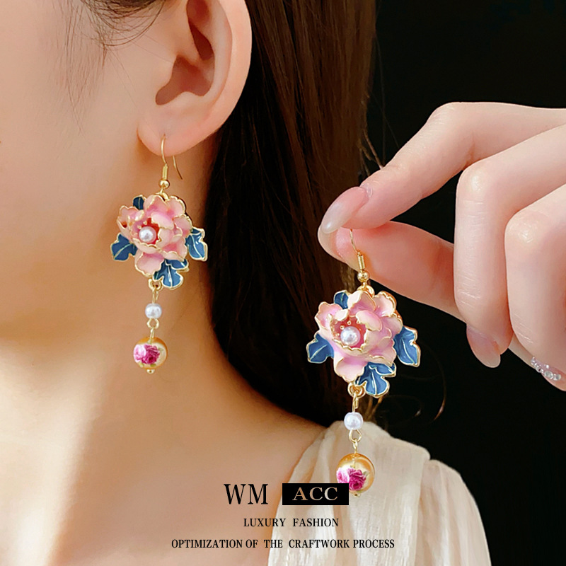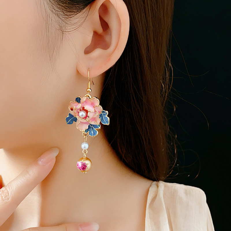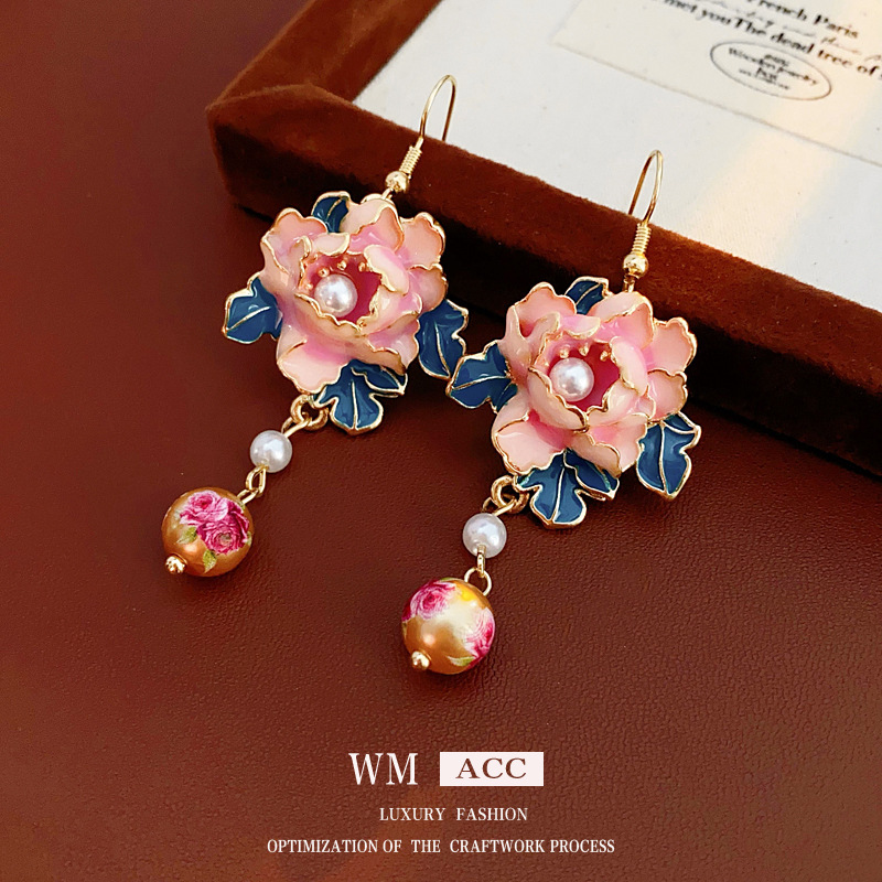 中古vintage滴油花朵珍珠耳钩复古高级感流苏耳环小众轻奢耳饰女