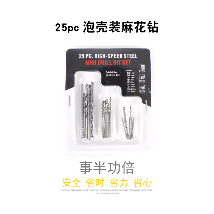 【25pc套装尺寸】:0.5毫米x 5、0.6毫米x 5、1.0毫米x 3、1.2毫米x 2、1.5毫米x 2,1.8毫米x 2 2.0毫米x 2,2.3毫米x 2,3.0mm x 2,共25个。 包装尺寸:10.5*14.5*1.5cm
