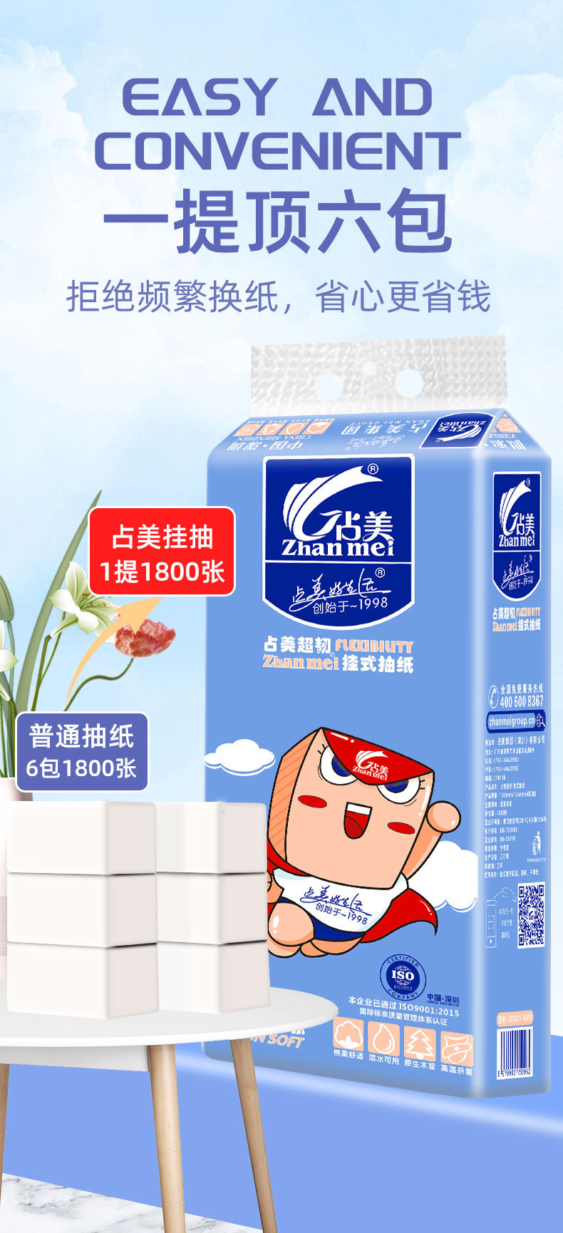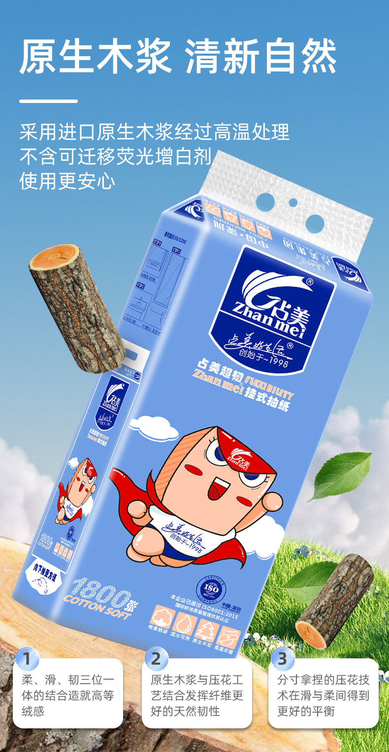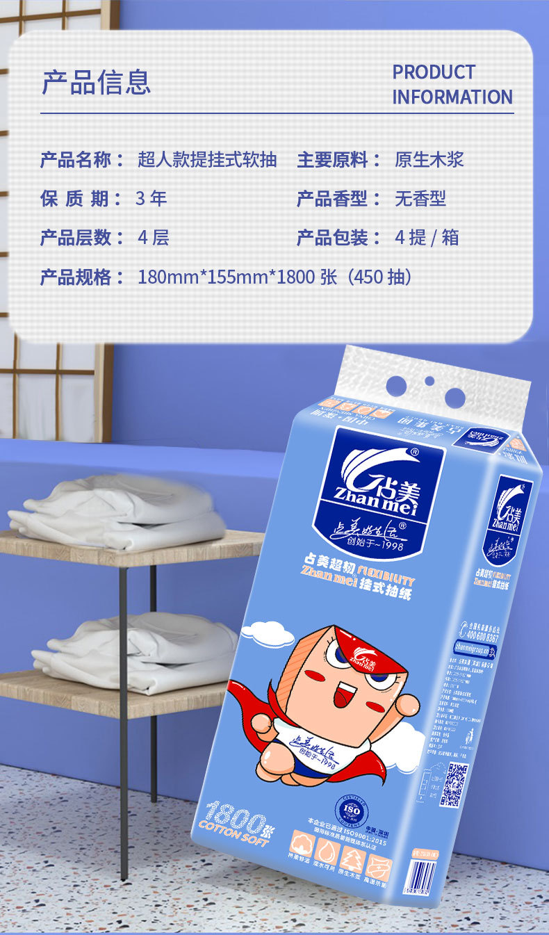 品牌: 占美 商品条形码: 6970980150962 重量: 620 材质: 原生木浆 纸巾尺寸(cm): 180mm×155mm 型号: 超人1800 包装尺寸(cm): 长15.5cm× 宽9cm×高34cm 保质期: 3年 产地: 广东 加工定制: 否 香型: 无香 张数: 1800张 纸品等级: 合格品 包装规格: 长15.5cm× 宽9cm×高34cm 层数: 四层 卫生许可证号: 粤卫消证字(2019)第9204号 是否进口: 否 克重: 620 重量: 0.5 kg/包