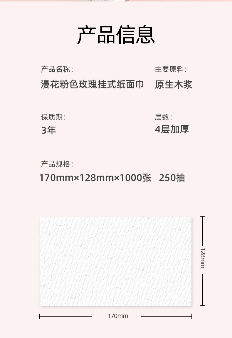 品牌: 漫花 商品条形码: 69 重量: 0 材质: 原生木浆 纸巾尺寸(cm): 170mm*128mm 型号: 漫花玫瑰悬挂式抽纸 包装尺寸(cm): 0 保质期: 3年 产地: 中国大陆 加印LOGO: 不可以 加工定制: 否 香型: 无香 张数: 1000张/提 纸品等级: 合格品 包装规格: 单提装、10提/箱 层数: 四层 主要下游平台: 亚马逊,独立站,LAZADA 主要销售地区: 北美,东北亚,中东 有可授权的自有品牌: 是 是否跨境出口专供货源: 是 重量: 0.5 kg/件