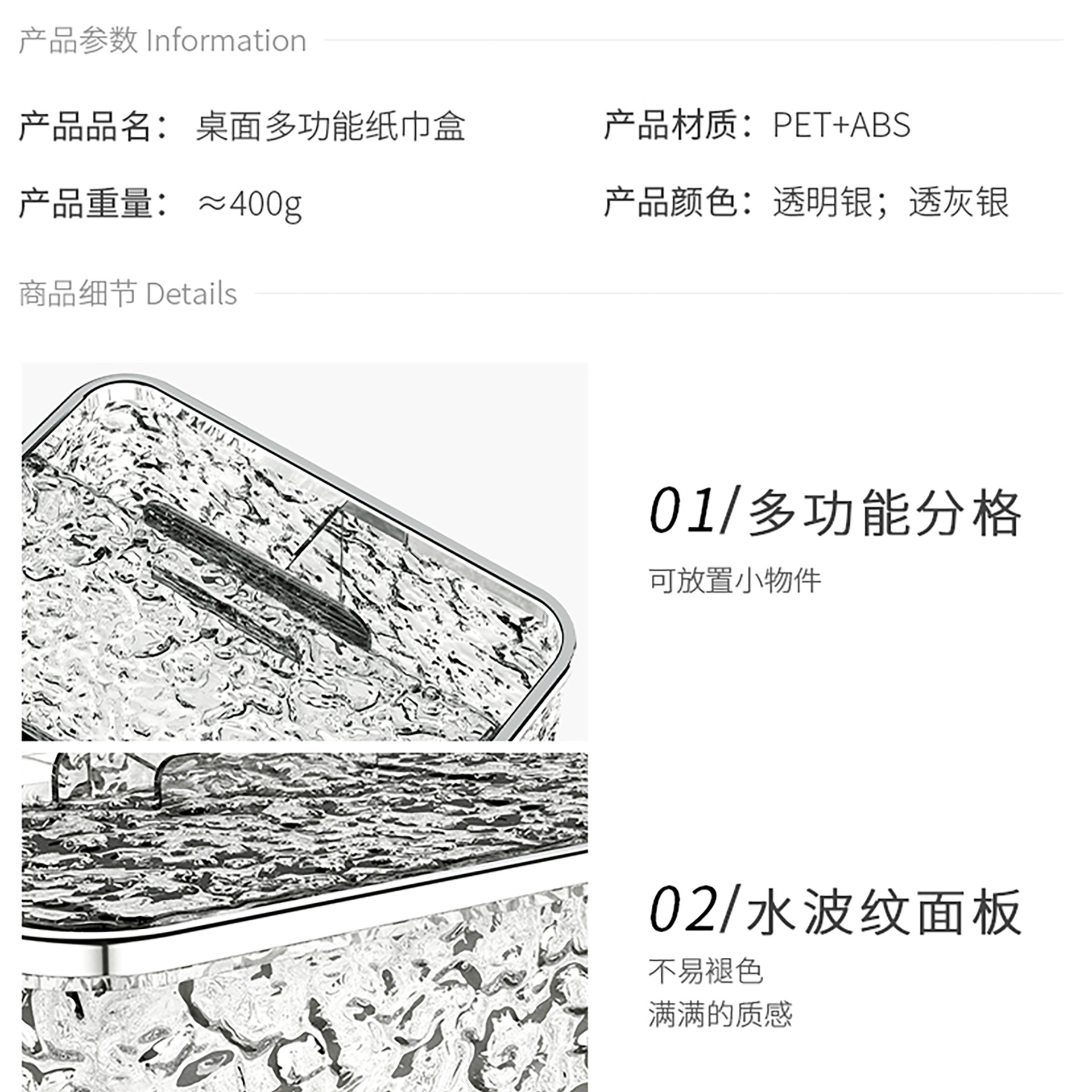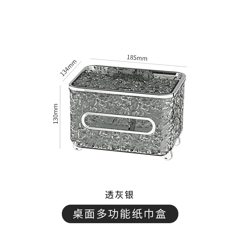 品牌: 亿米佳 是否进口: 否 材质: 塑料 适用纸巾: 抽取式纸巾 适用场合: 客厅,卫浴间,其他 型号: 多功能 产地: 宁波 箱装数量: 24 贸易属性: 内贸+外贸 加印LOGO: 不可以 加工定制: 否 适用送礼场合: 乔迁,广告促销,其他 产品上市时间: 2023 价格段: 10-20元 风格: 轻奢 专利: 否 货号: YM.6796 颜色: 透明银,透明灰 是否跨境出口专供货源: 否 产品类别: 纸巾盒 重量: 0.5 kg/个