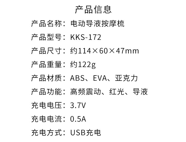 重量: 0.2kg 品牌: NINE BEAUTY 货号: kb-267 产品类别: 其他 物流服务: 快递上门 型号: kb-267 包装清单: 产品+充电线+说明书 是否跨境出口专供货源: 是 主要下游平台: 其他 有可授权的自有品牌: 是 功效: 头皮舒缓 适用季节: 四季 适用人群: 通用 颜色: 银色,黑色,白色导液梳,172白色 重量: 0.5 kg/个