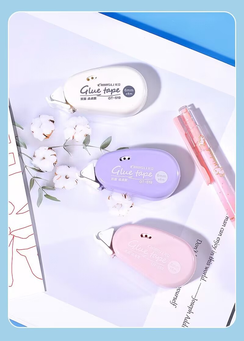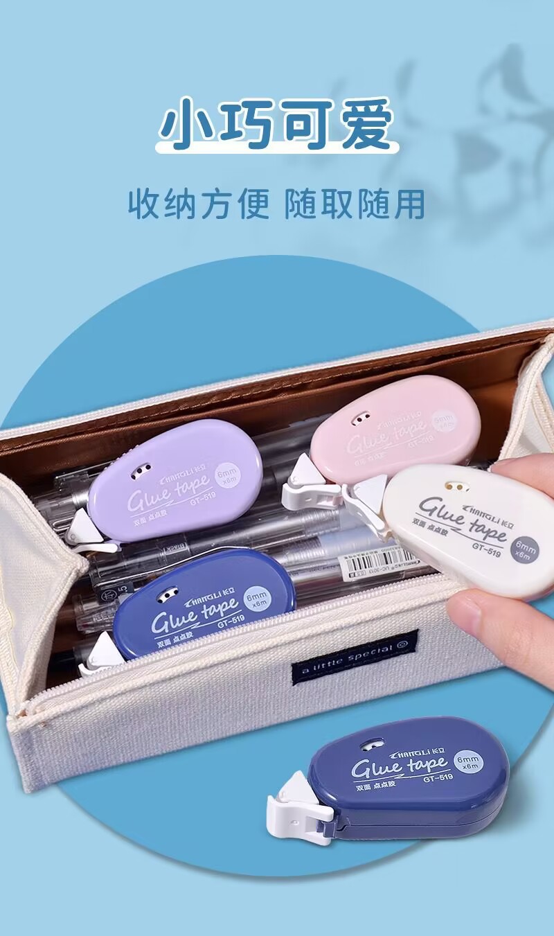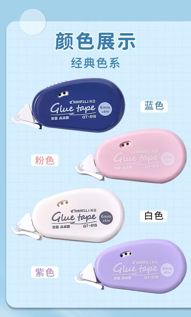 货号: 519 长度: 6M 厚度: 0.2MM 基材: pet 加印LOGO: 可以 宽度: 6MM 类型: 双面胶带 品牌: 长立 适用范围: 学习用品,办公文具 型号: 519 加工定制: 是 是否进口: 否 有可授权的自有品牌: 是 是否跨境出口专供货源: 是 销售方式: 批发零售 规格: 单色随机,紫色,蓝色,粉色,白色 重量: 0.001 kg/个