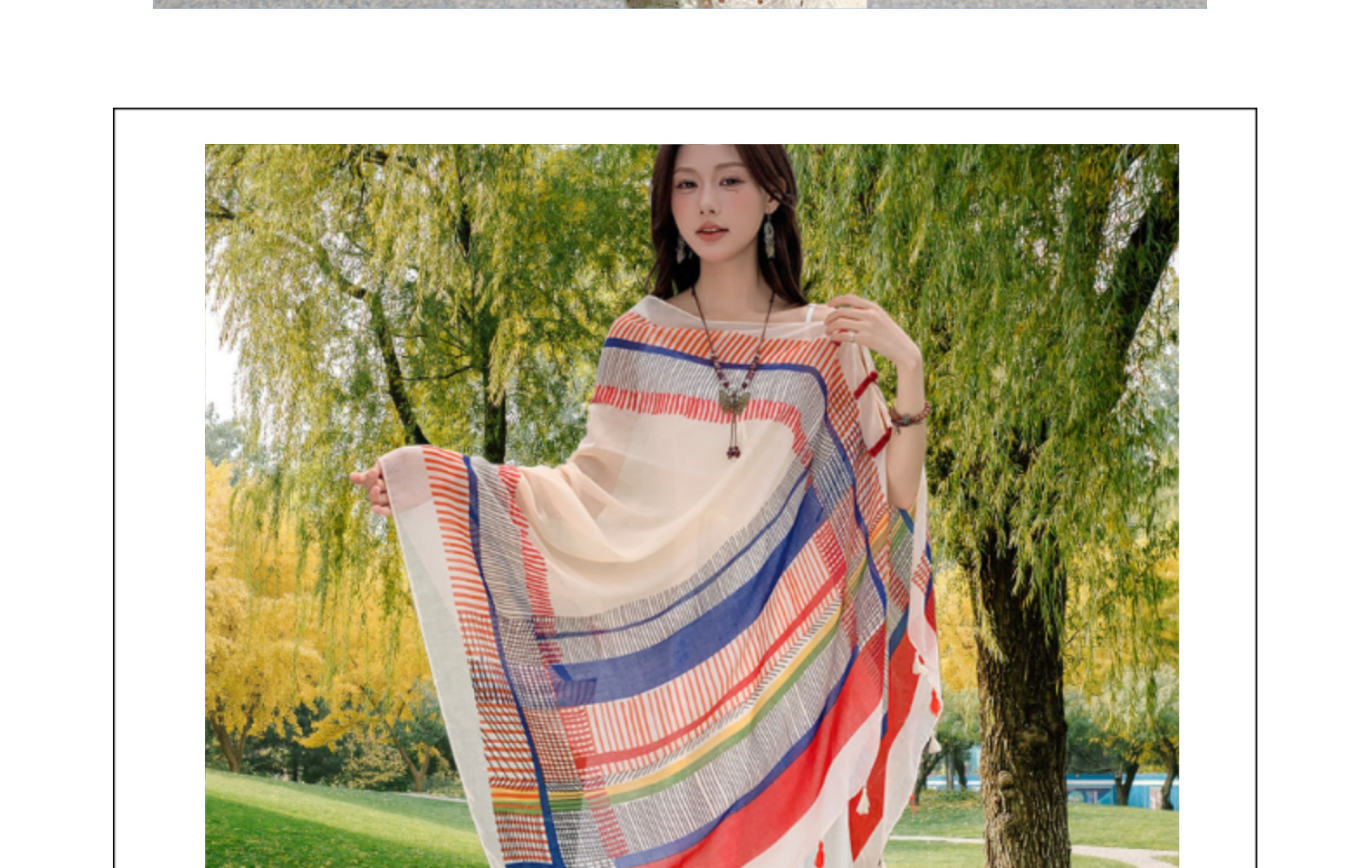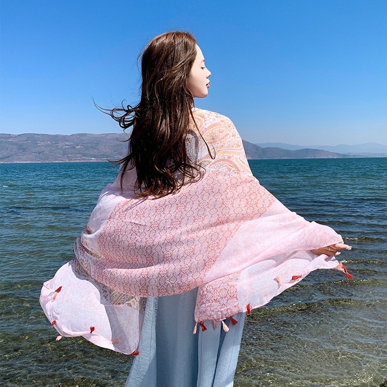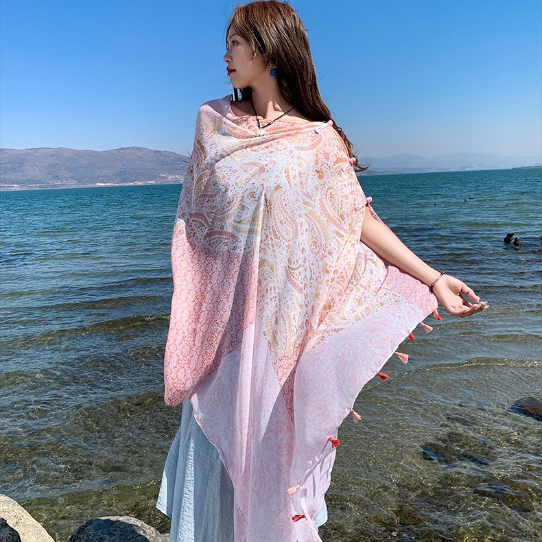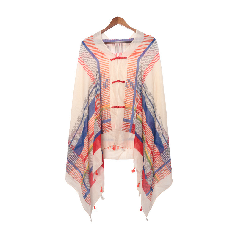 夏季防晒薄款披肩采色条纹盘扣挂须民族风旅游穿搭丝巾沙滩纱巾女 English | 投诉