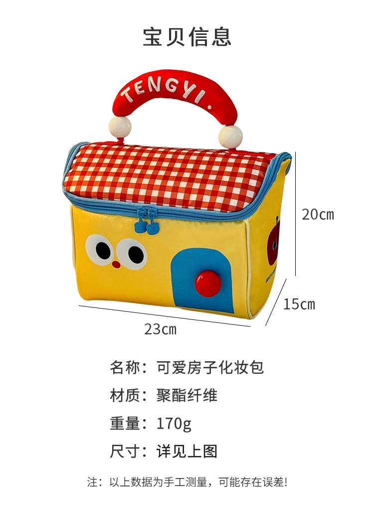 产品类别: 化妆包 品牌: 柠本 是否进口: 否 型号: G908000 形状: ~ 材质: ~ 功能: 多用途 适用场景: 卧室 收纳场景: 旅行收纳,化妆收纳 适用范围: 化妆品 风格: 卡通萌趣 颜色: 黄色小屋,粉色小屋,绿色小屋 产地: ~ 箱装数量: ~ 产品上市时间: 2025 价格段: 10-20元 贸易属性: 内贸+外贸 专利: 否 货号: G908 是否跨境出口专供货源: 否 重量: 0.1 kg/件