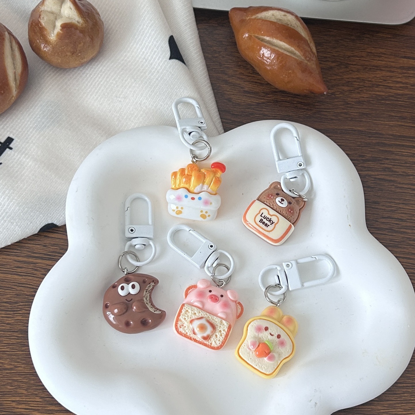 货号: 白扣E32 颜色: 小兔吐司,薯条,小熊饼干,小猪鸡蛋,曲奇 材质: 树脂 是否IP授权: 否 钥匙配饰分类: 钥匙扣 风格: 可爱风 是否属于礼品: 是,个人礼品 适用送礼关系: 情侣,朋友,孩子,同学 是否专利货源: 否 适用节日: 圣诞节,教师节,万圣节,复活节 送礼用途: 广告礼品,促销赠品,会议礼品,福利礼品, 适用送礼场合: 生日,旅游纪念,派对聚会 重量: 0.02 kg/个