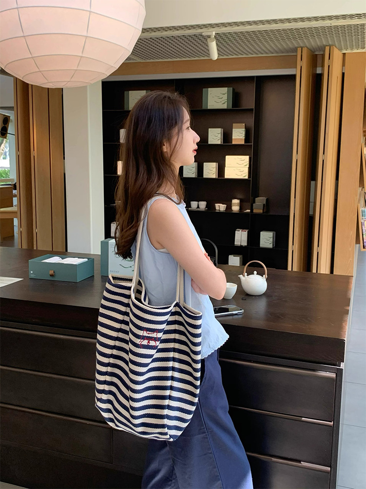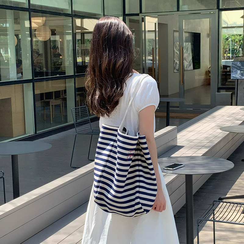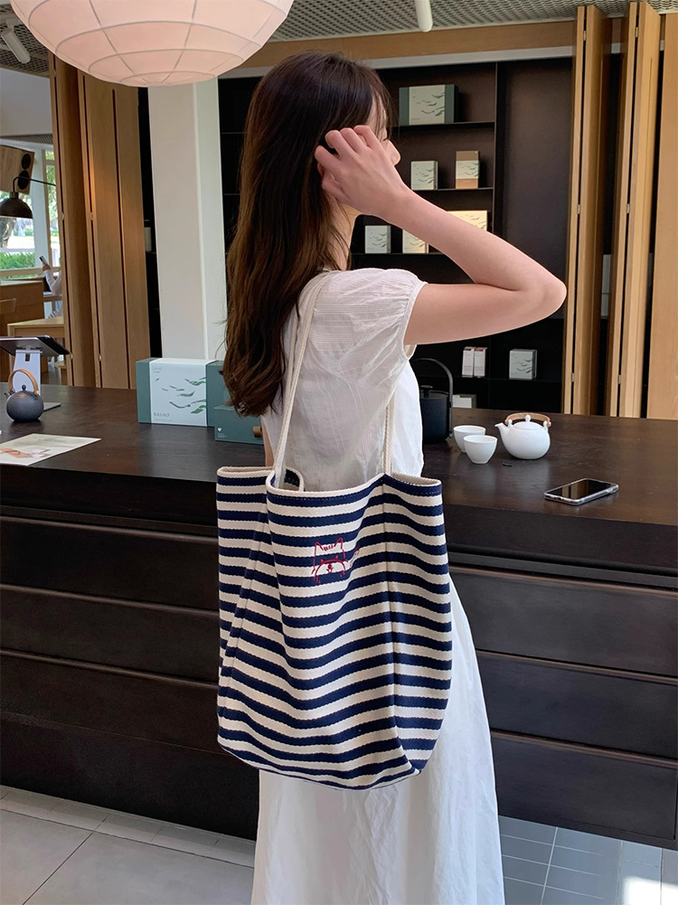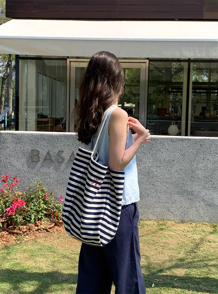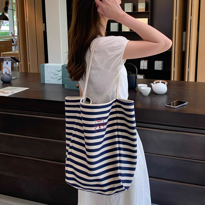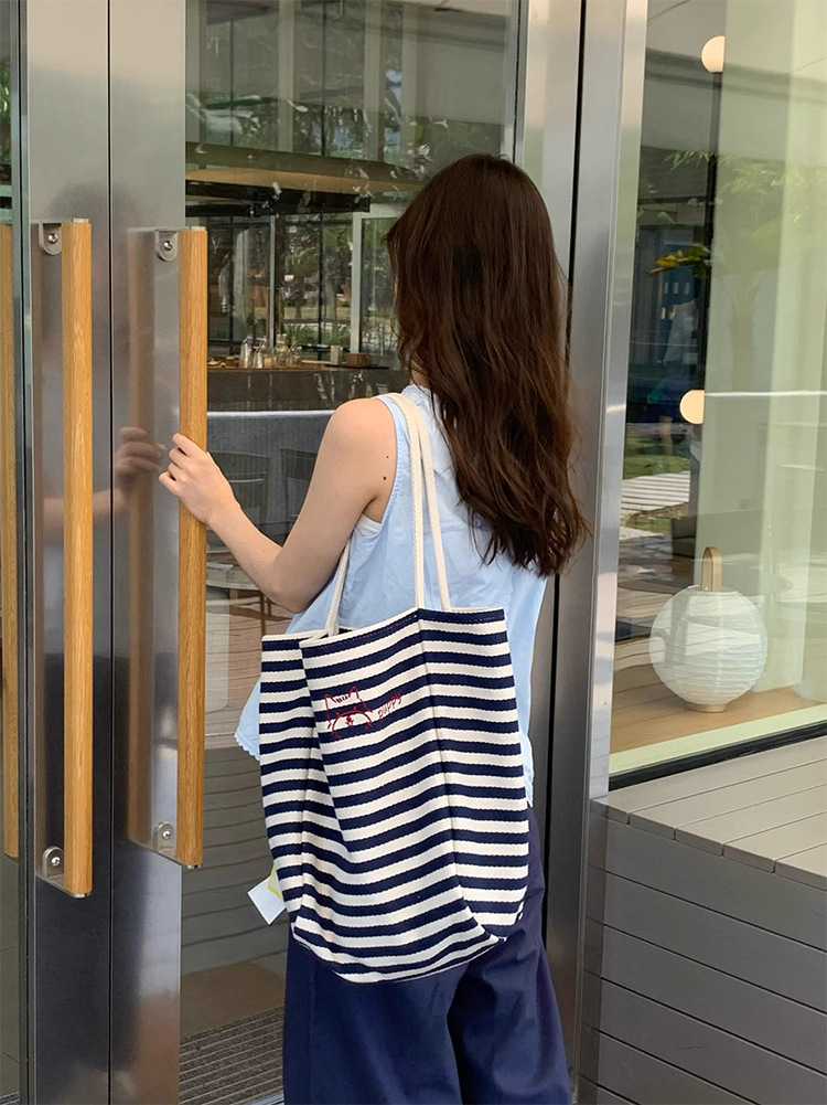 女大学生上课通勤包布袋条纹帆布包大容量托特包慵懒风新款单肩包