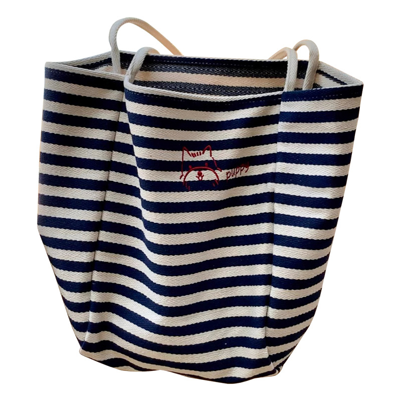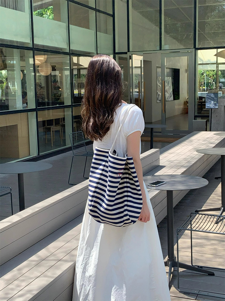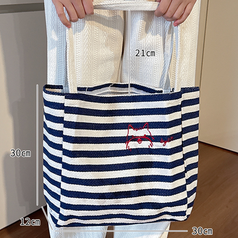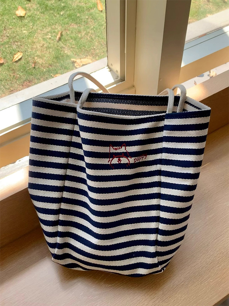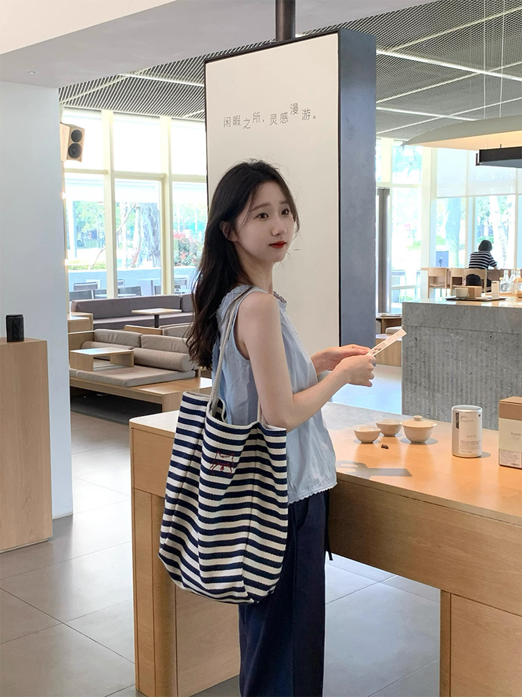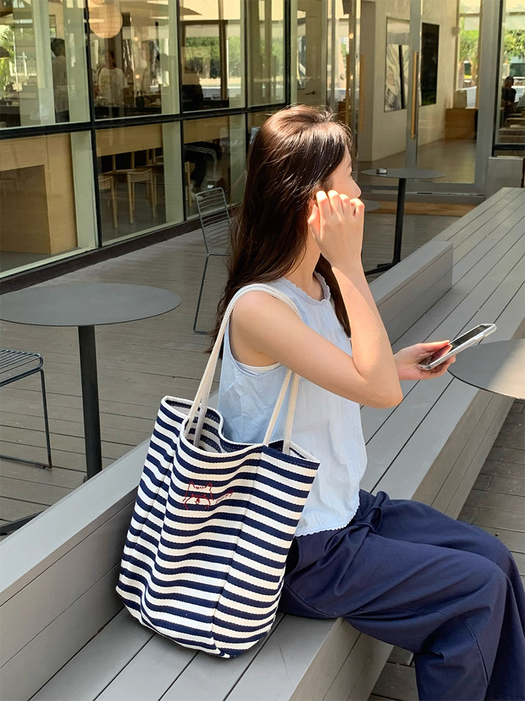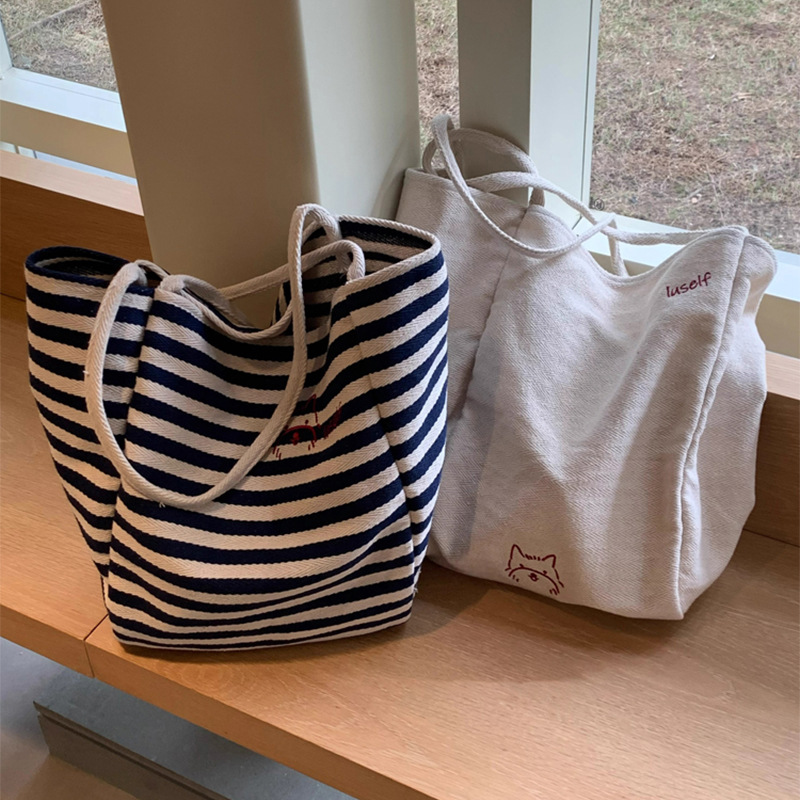 女大学生上课通勤包布袋条纹帆布包大容量托特包慵懒风新款单肩包