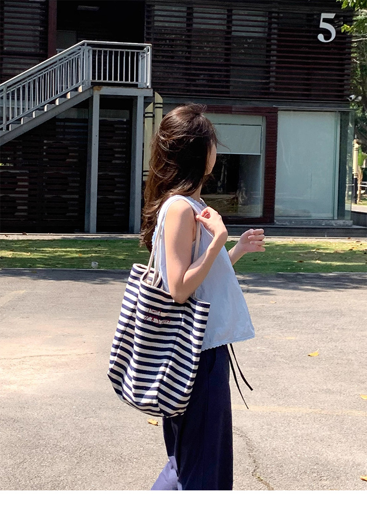 女大学生上课通勤包布袋条纹帆布包大容量托特包慵懒风新款单肩包 投诉