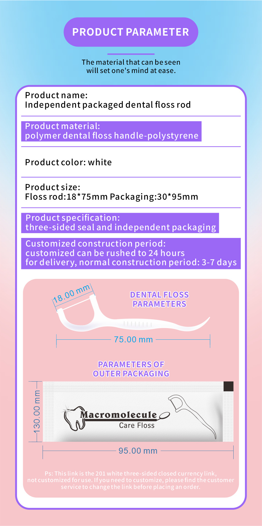 产品类别: 牙线 品牌: 颜诚 是否进口: 否 材质: 塑料 是否一次性: 是 只数: 300只以上 货号: TO-W201 产地: 广东东莞 贸易属性: 内贸+外贸 箱装数量: 1支每包*500包每袋 长度: 30*95mm 是否跨境出口专供货源: 否 是否有专利: 否 单包/袋只数: 300只以上 产品属性3: 高分子牙线棒 独立包装牙线棒 产品属性1: 可定制一次性包装牙线 产品属性2: 独立包装牙线 重量: 0.5 kg/袋