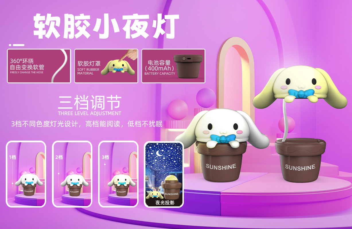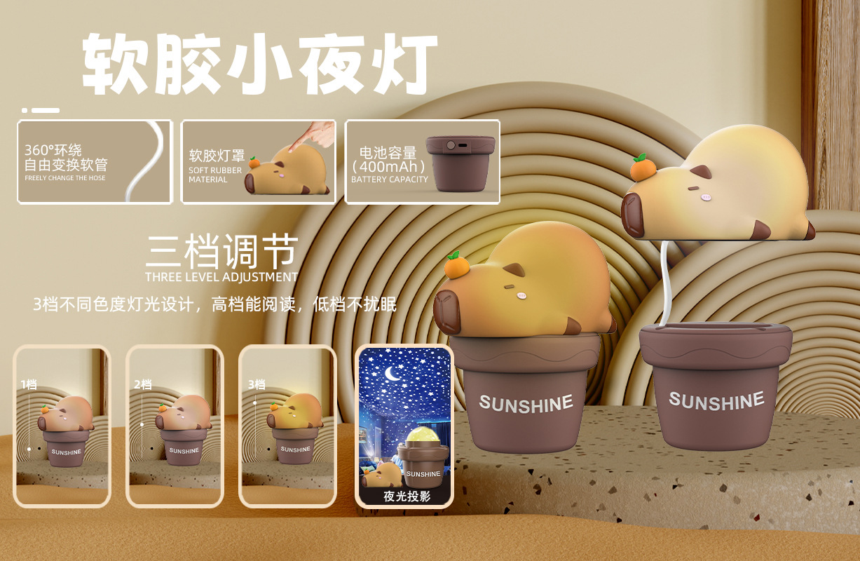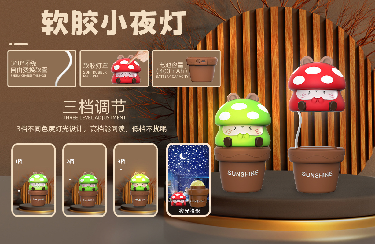 多肉软胶小夜灯礼品跨境外贸亚马逊新款3档调光投影充插USB小台灯