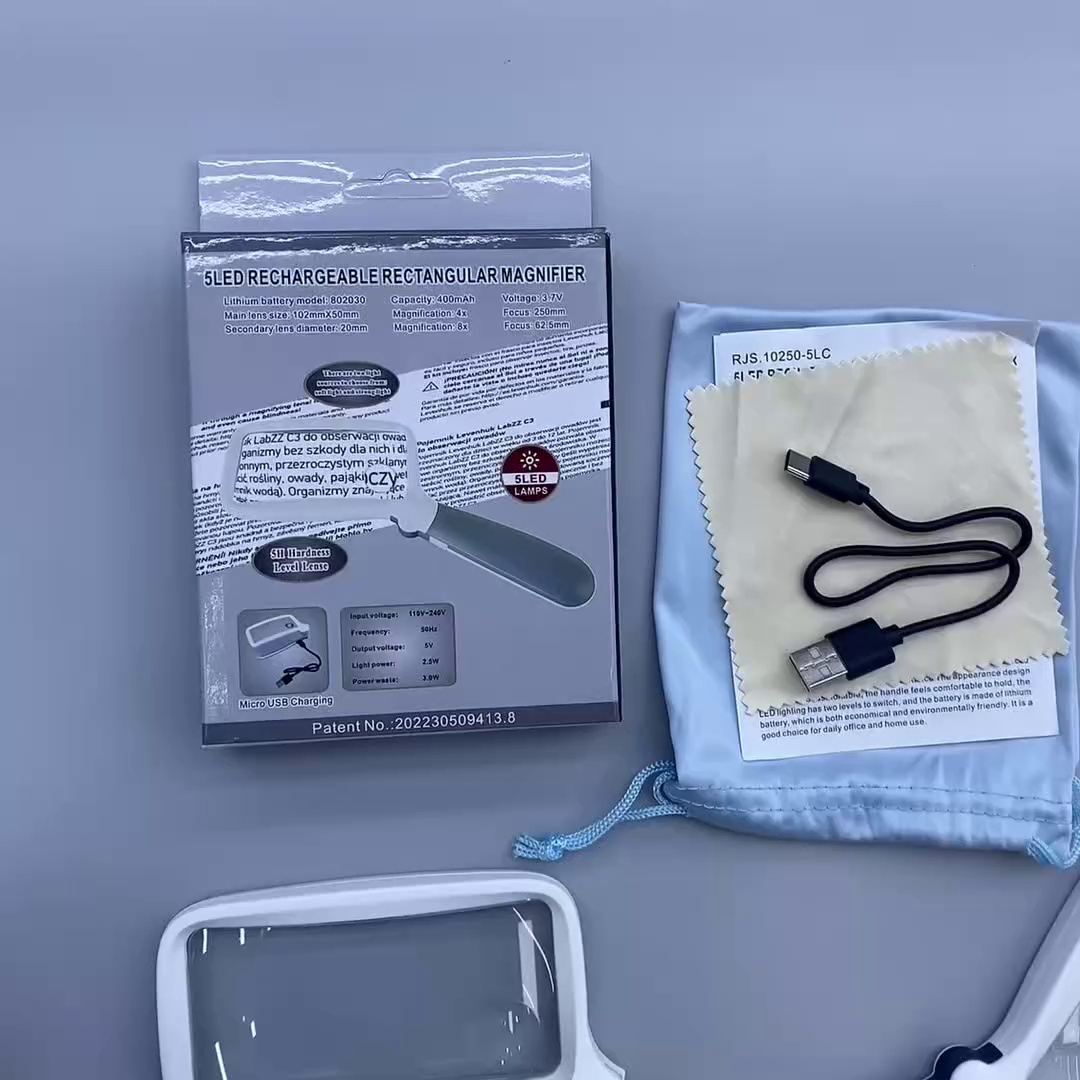 产品包装:彩盒+布袋+中英文说明书+USB充电线+擦镜布