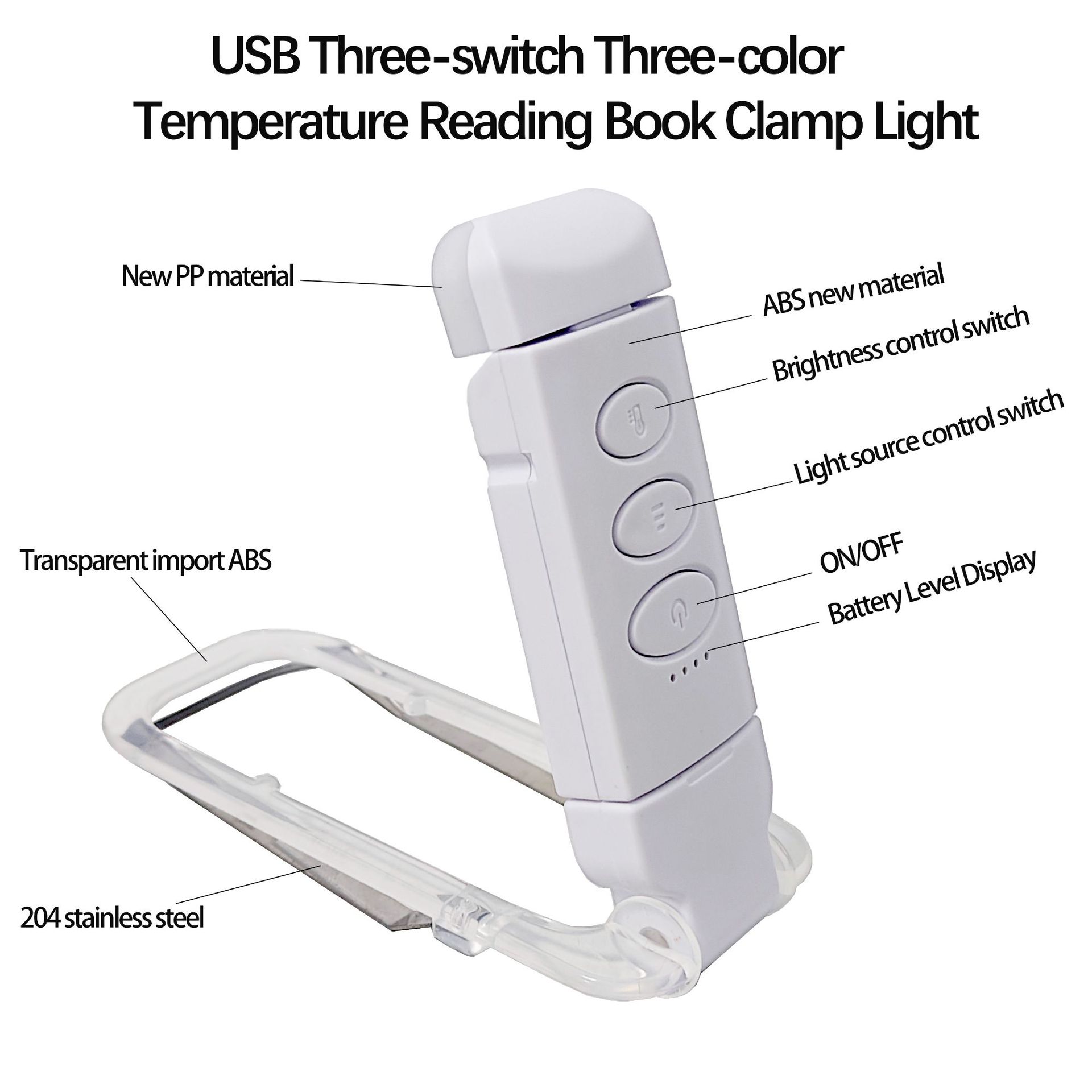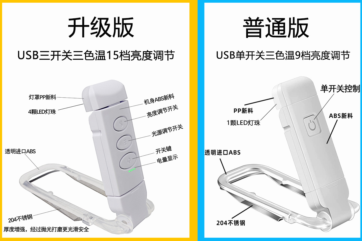 跨境LED升级三开关夹子灯USB充电护眼便携简约折叠式书夹灯 English | 投诉