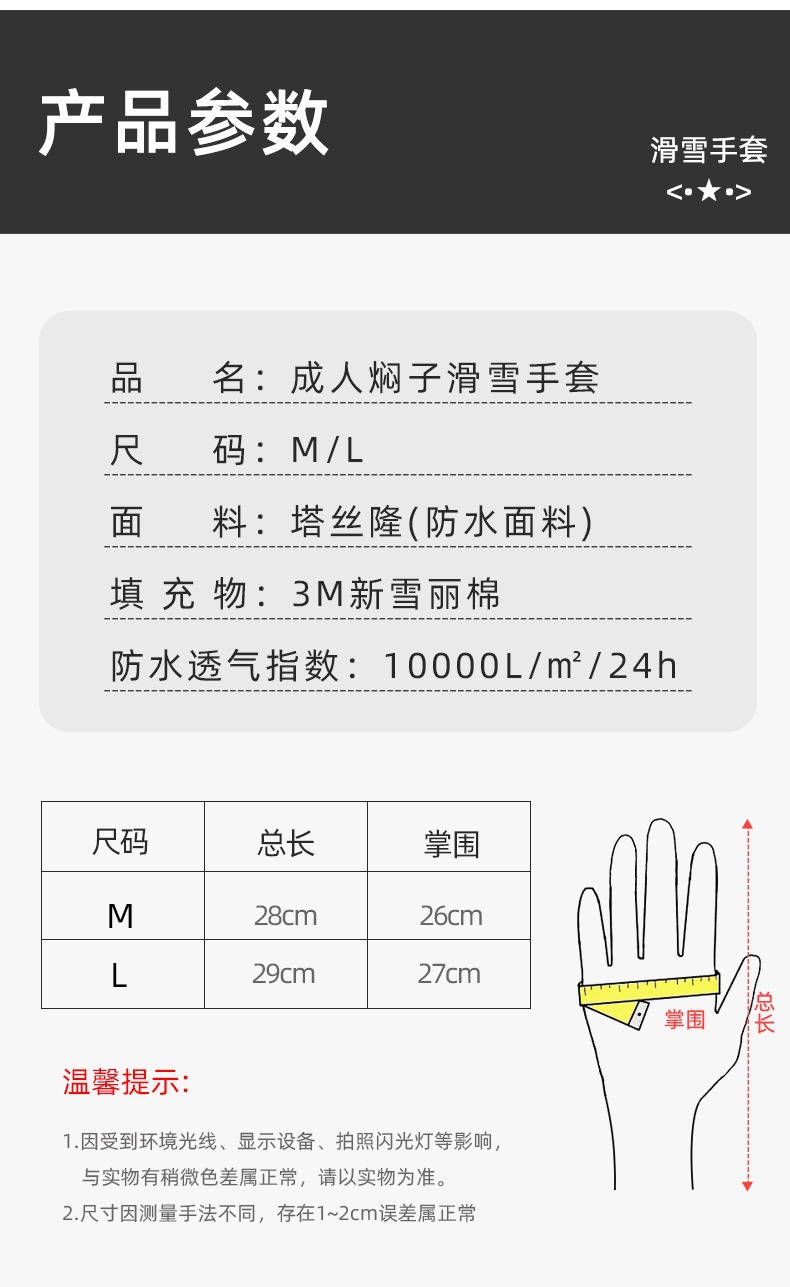 颜色: 拉链焖子-黑色【3M新雪丽棉+内五指+防 尺码: M,L 适用性别: 中性 适用年龄段: 成年 材质: 涤纶(聚酯纤维)