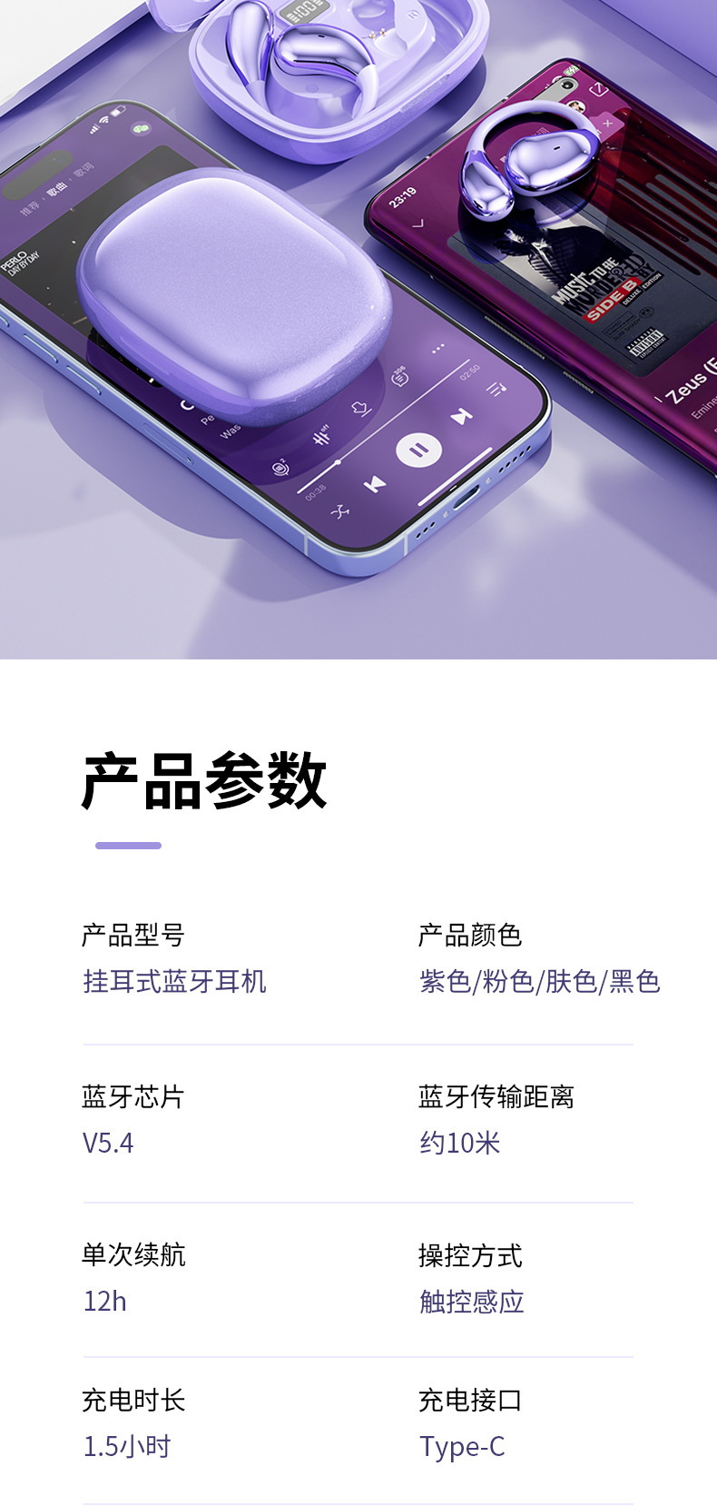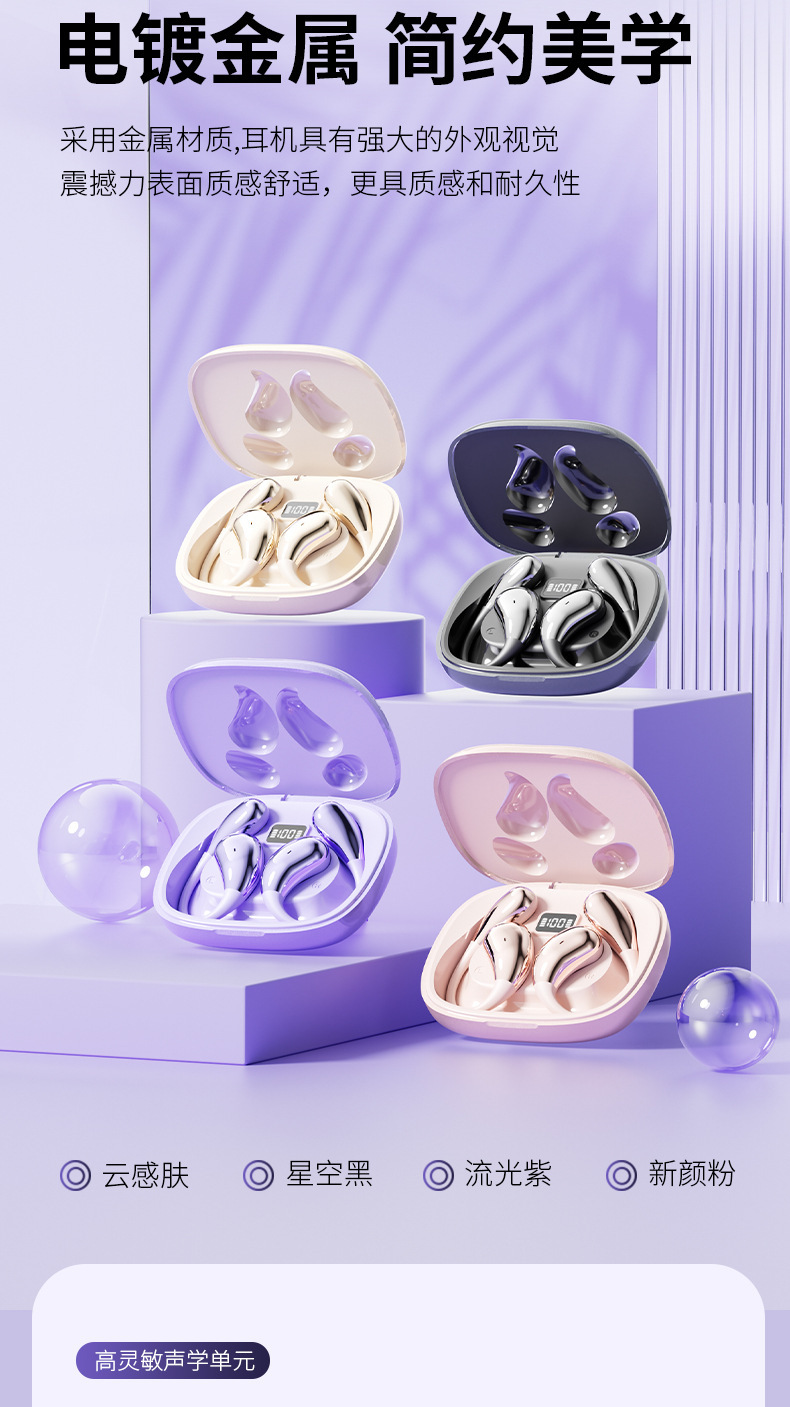 品牌: 中性 传输范围: 10米 功能: 通话功能,语音控制,支持音乐,12489 蓝牙协议: 5.4 使用方式: 挂耳式 是否单双耳: 双边立体声 颜色: 黑色+电镀工艺,肤色+电镀工艺,粉红色+ 有可授权的自有品牌: 是 支持订制: 支持 模具类型: 私模