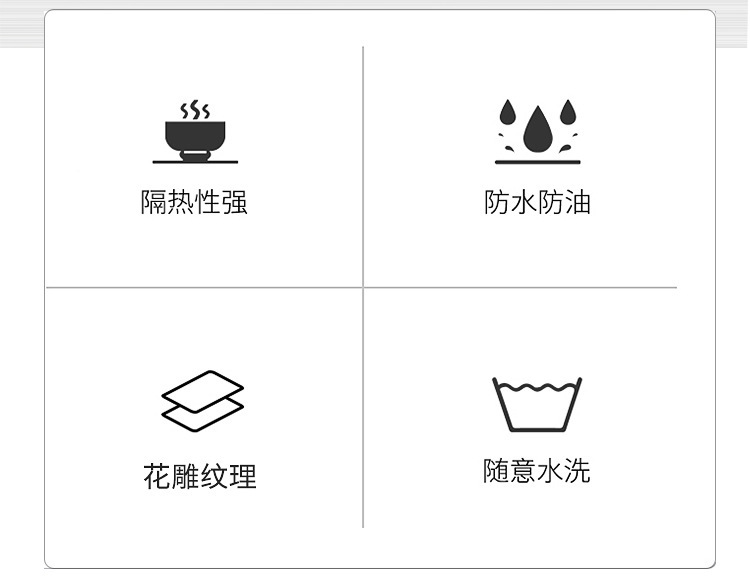【易于清洁】:当餐垫上面有液体或酱汁时,只需用湿抹布或纸擦拭即可;当有污垢后也可以用刷子/清洗剂清洁它们。