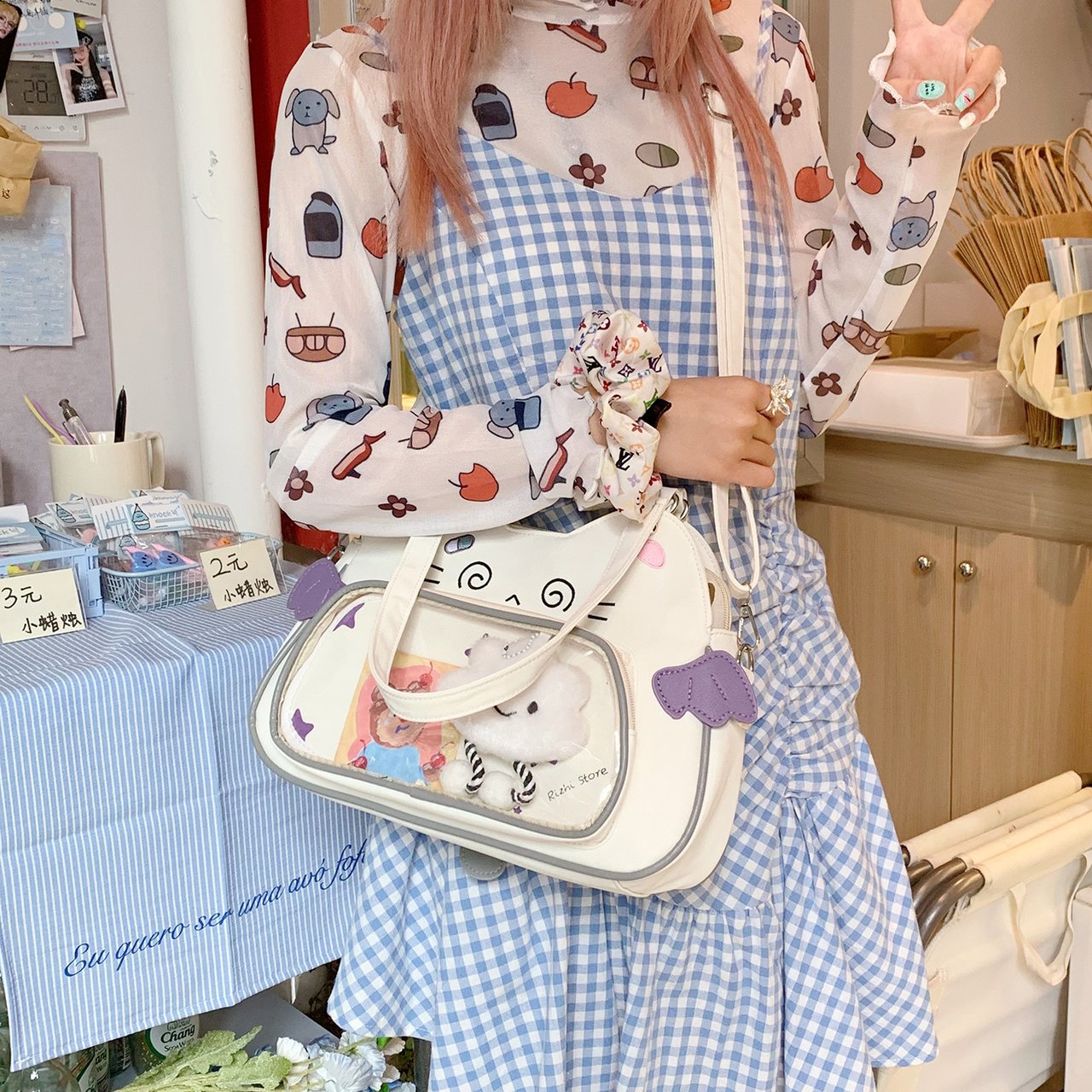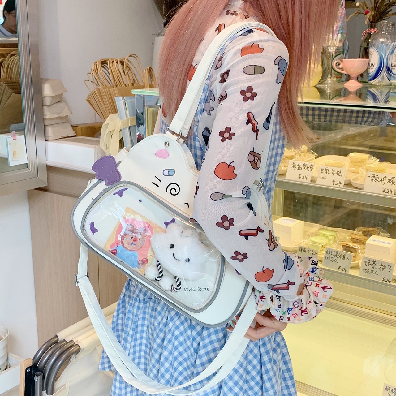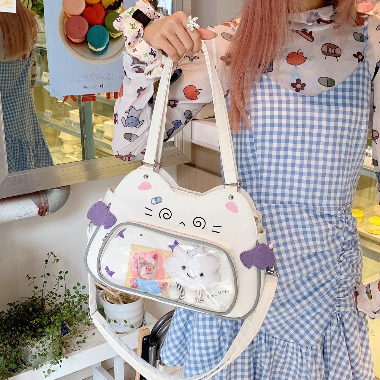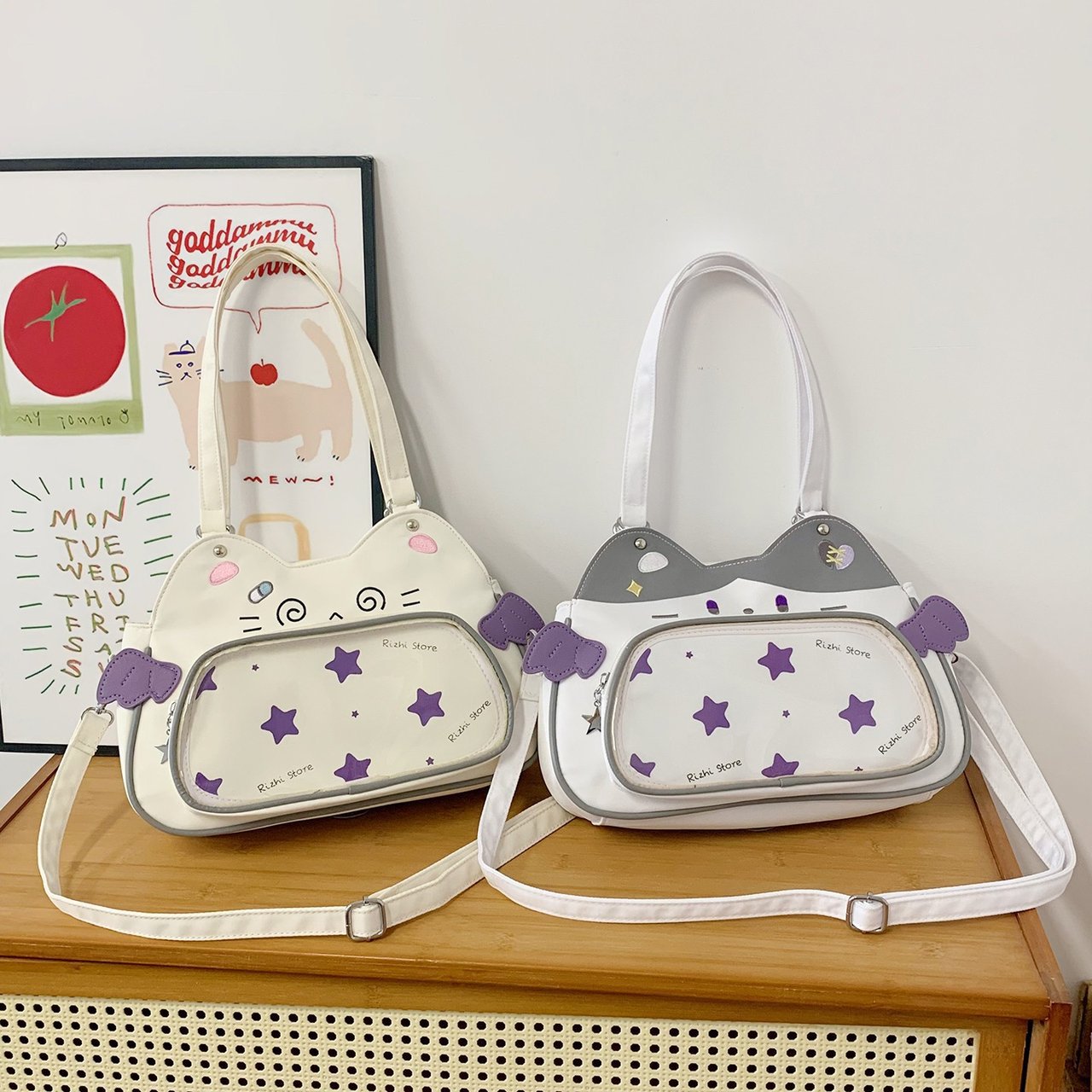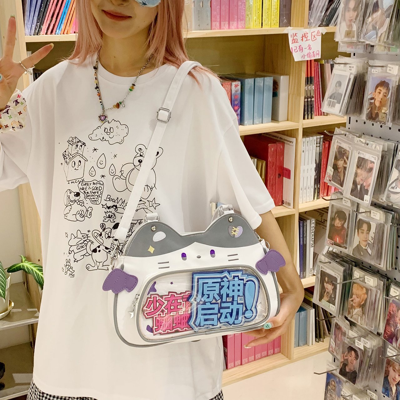 日系可爱女生恶魔小猫轻便小食量透明谷子痛包逛街通勤单肩斜跨包 English | 投诉