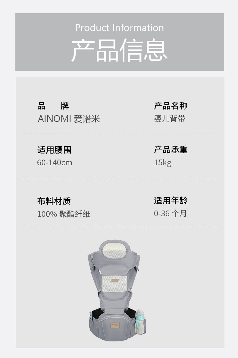 产品类别: 腰凳 货号: 2016 是否进口: 否 最大承重: 15kg 品牌: ainomi/爱诺咪 适用年龄: 0-36个月 商品条形码: 2016 颜色: 灰色,丈青色,黑色 是否跨境出口专供货源: 否 重量: 0.5 kg/个