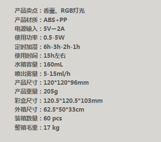 品牌: 其他 电源方式: USB 功能: 加湿,香薰,助眠,雾化器,自动喷香机,扩 适用面积: 10㎡以下 外形: 圆形 噪音: 36dB以下 定时功能: 8小时以上 水箱容量: 1-2.5L(含) 缺水断电保护: 是 操作方式: 机械式 重量: 0.5 kg/个