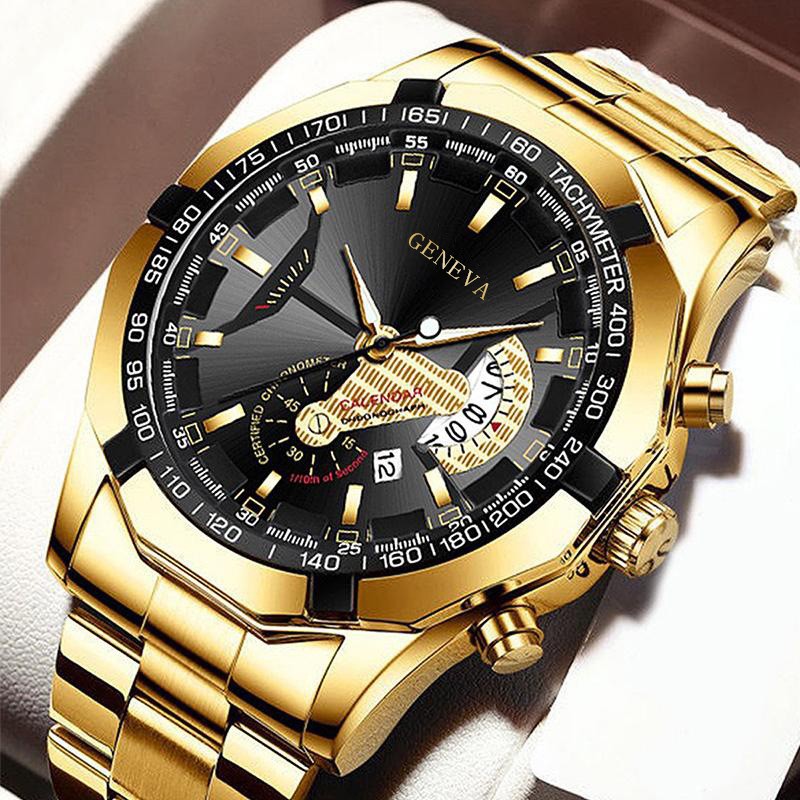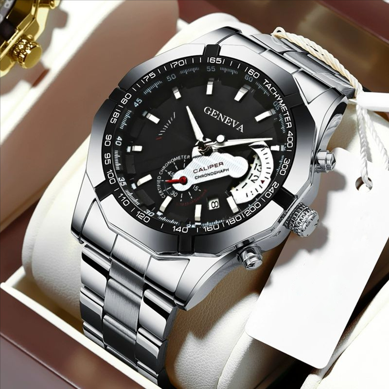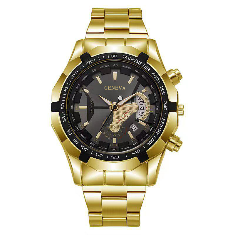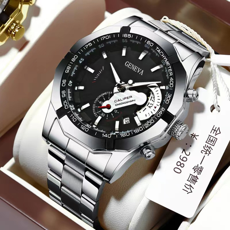 跨境玻璃男士商务手表钢带石英表数字月份机械表刻度三眼手表批发