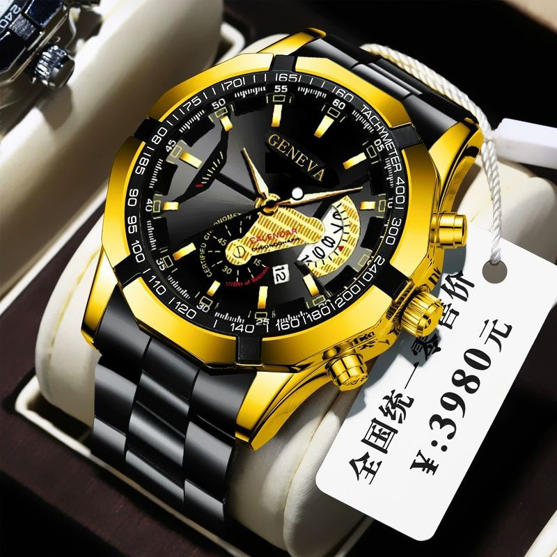 跨境玻璃男士商务手表钢带石英表数字月份机械表刻度三眼手表批发 English | 投诉