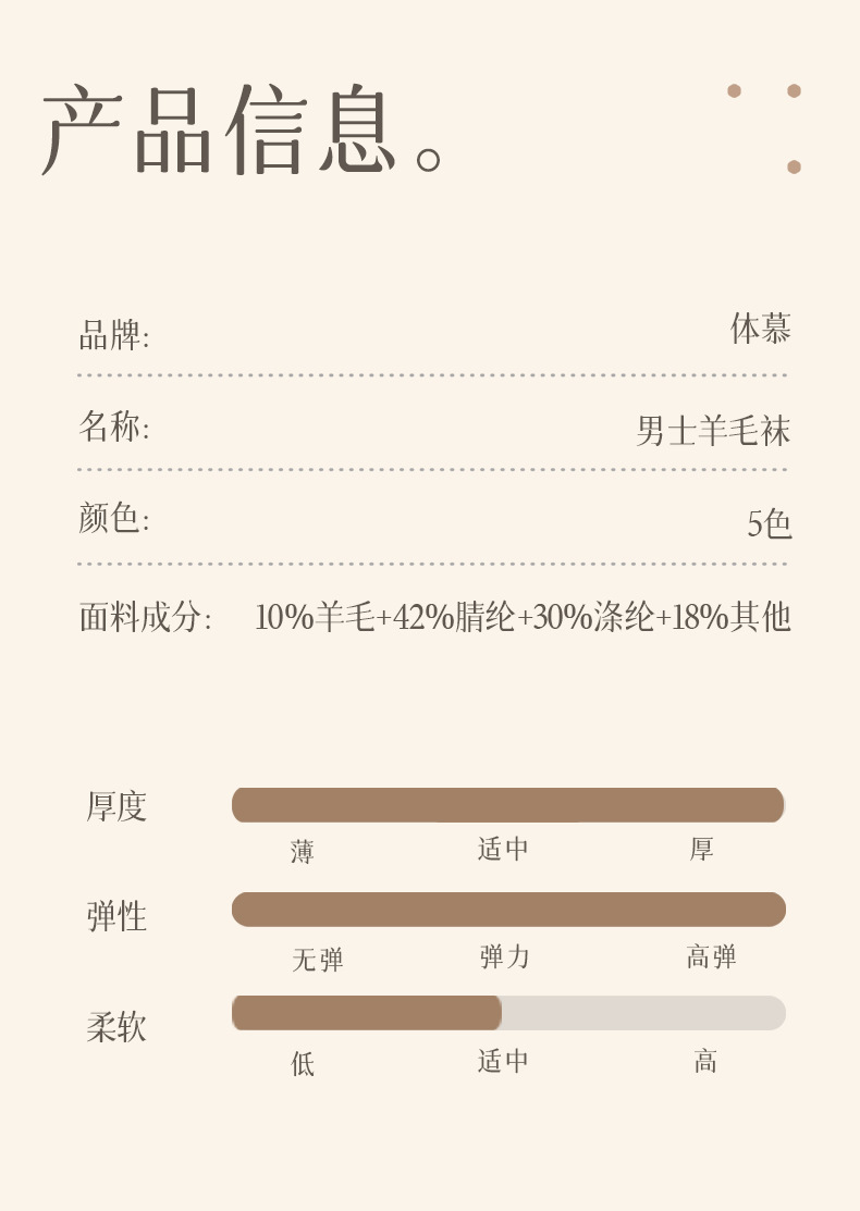 面料名称: 羊毛 无骨缝制: 否:机器缝头 功能: 吸汗,防摩擦 适用性别: 男 适用年龄段: 青年(18-40周岁),中年(40-60 主面料成分: 羊毛 筒高: 中筒 上市时间: 2023年冬季 适合季节: 冬季 产品类别: 普通休闲袜 重量: 0.05 kg/双