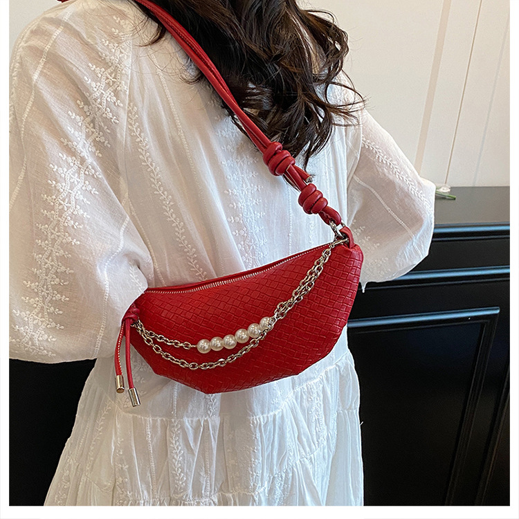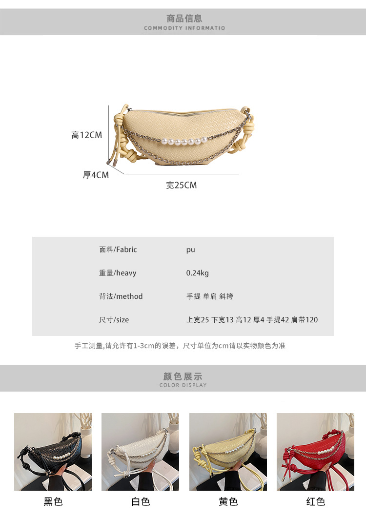 颜色: 黑色,白色,黄色,红色 风格: 跨境风潮 货号: - 材质: PU 箱包潮流款式: 腰包 箱包大小: 中 流行元素: 编织,链条 上市年份季节: 2025年秋季 里料质地: 涤棉 箱包形状: 水饺型 重量: 0.34 kg/件