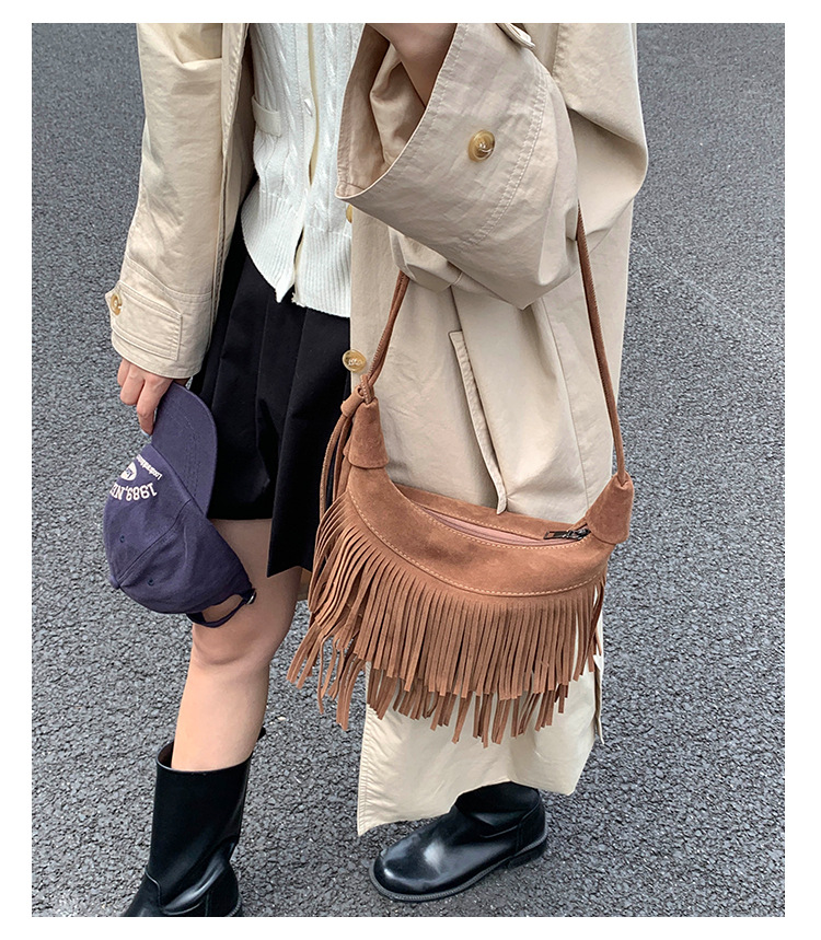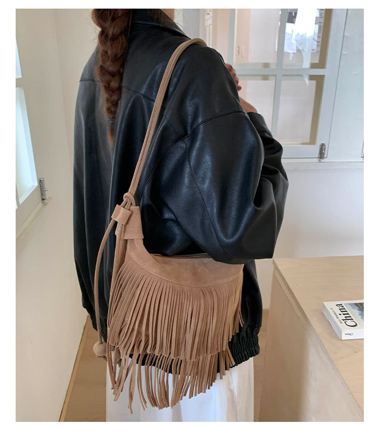 跨境外贸时尚磨砂绒流苏包百搭高级感单肩女包简约复古腋下饺子包