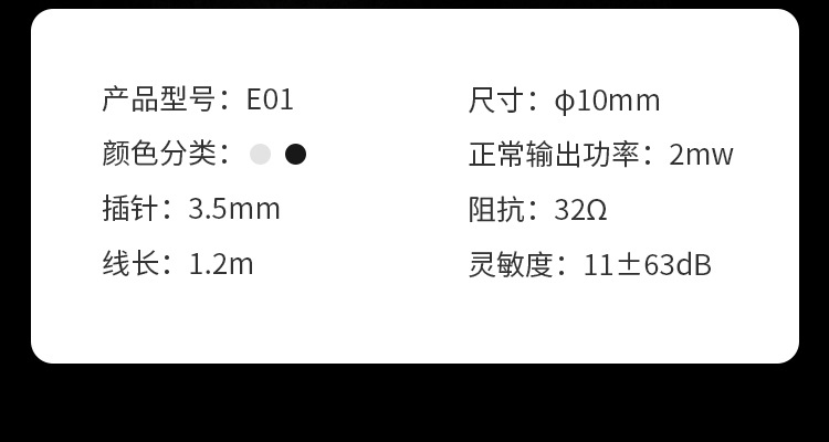 品牌: HONGBIAO SM 货号: E-01 型号: E-01 上市时间: 2021.5.25 货源类别: 现货 佩戴方式: 耳塞式 耳机输出音源: 通用 插头直径: 3.5mm 插头类型: 直插型 是否无线耳机: 有线耳机 有无麦克风: 有 频响范围: 20-20K 阻抗: 32 灵敏度: 95±5dB 失真率: 2 导线长度: 1.2 喇叭直径: 12 耳塞/耳罩材质: 硅胶 耳机线材质: tpe纳米 用途: 通用 重量: 0.5 kg/副