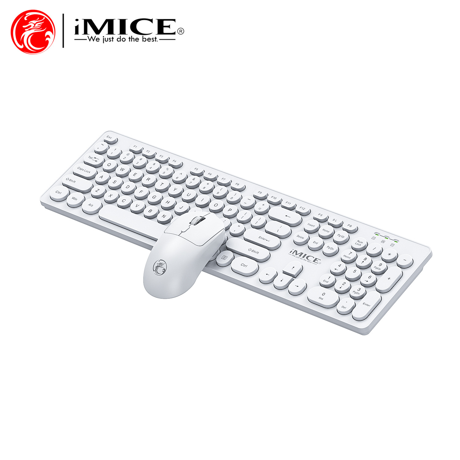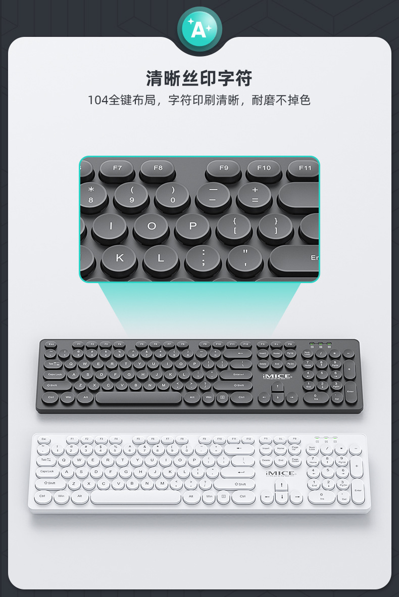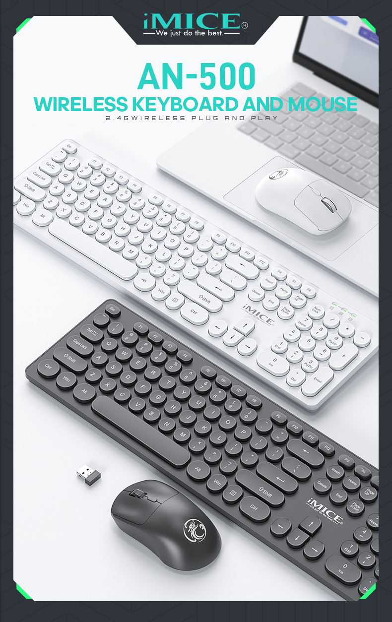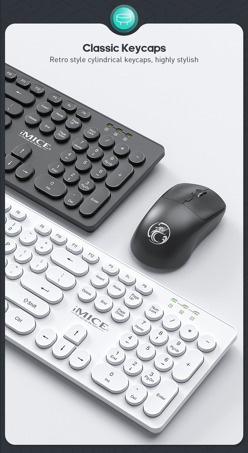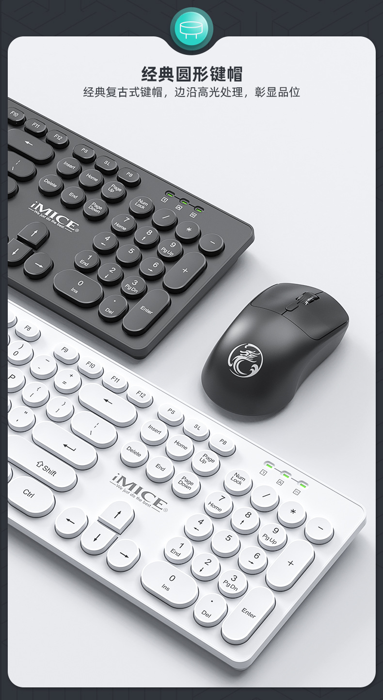 IMICE品牌AN-500无线连接键盘鼠标套装黑白圆形朋克键帽办公套装 English | 投诉