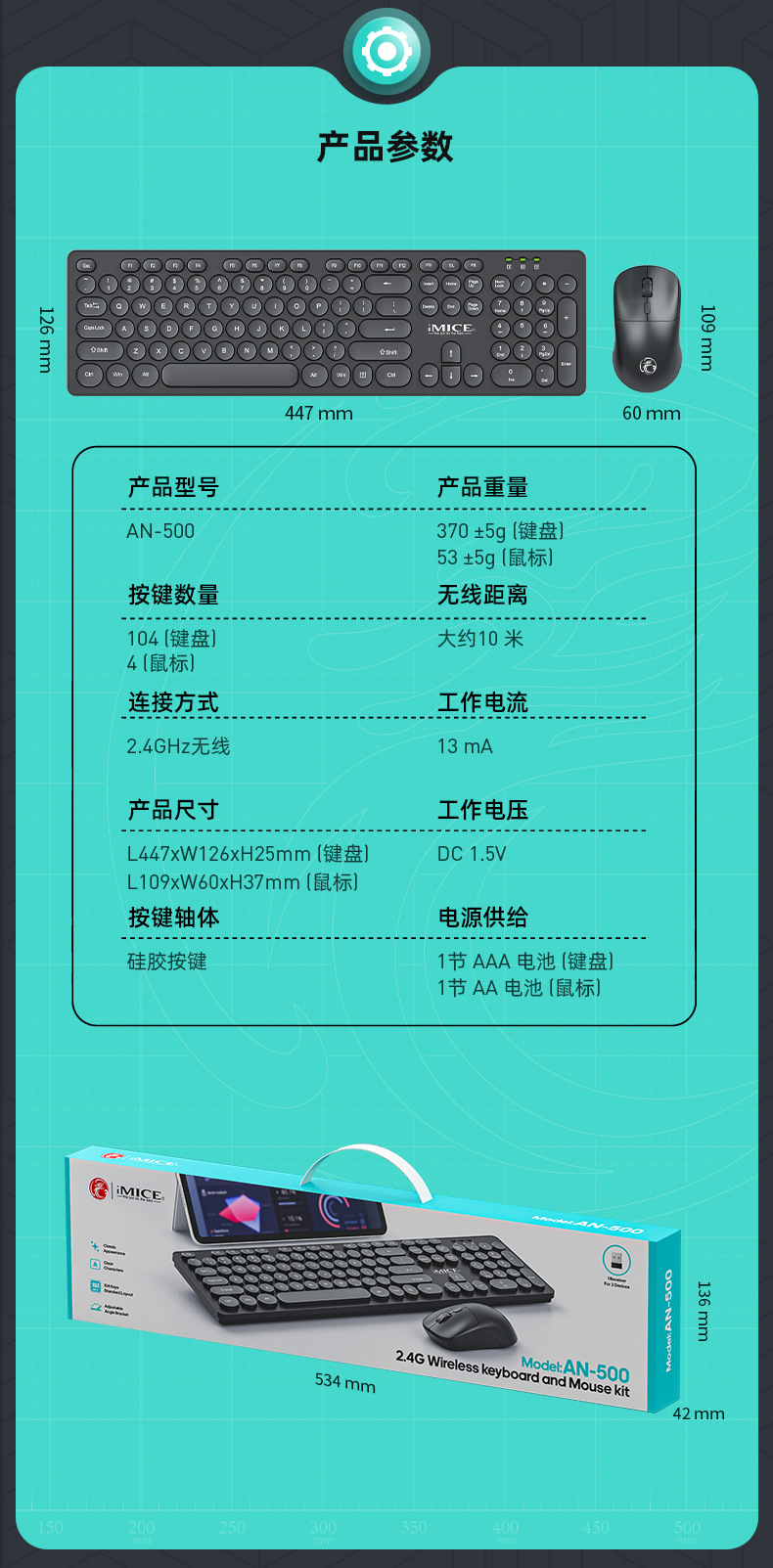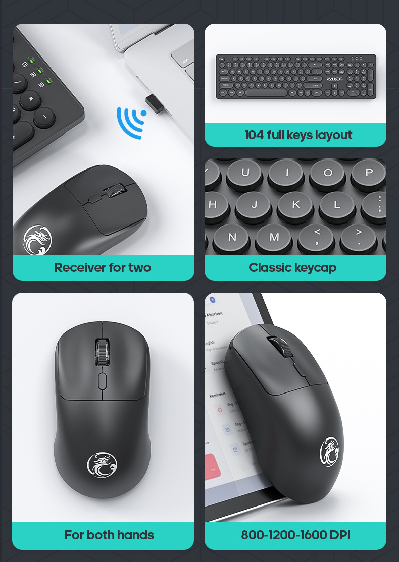 按键数: 键盘104 鼠标4 货号: AN-500 产品尺寸: 433*125*26MM 工作方式: 无线 光学分辨率: 800-1200-1600DPI 加印LOGO: 可以 类型: 薄膜式键盘 品牌: IMICE 适用对象: 笔记本 台式机 线长: 无线 型号: AN-500 颜色: 黑色 白色 上市时间: 2024 售后服务: 店面三包 滚轮数: 1 无线技术: 2.4G 货源类别: 现货 最快出货时间: 48小时 包装清单: 键盘*1、鼠标*1、USB接收器*1 鼠标大小: 小 重量: 0.5 kg/套