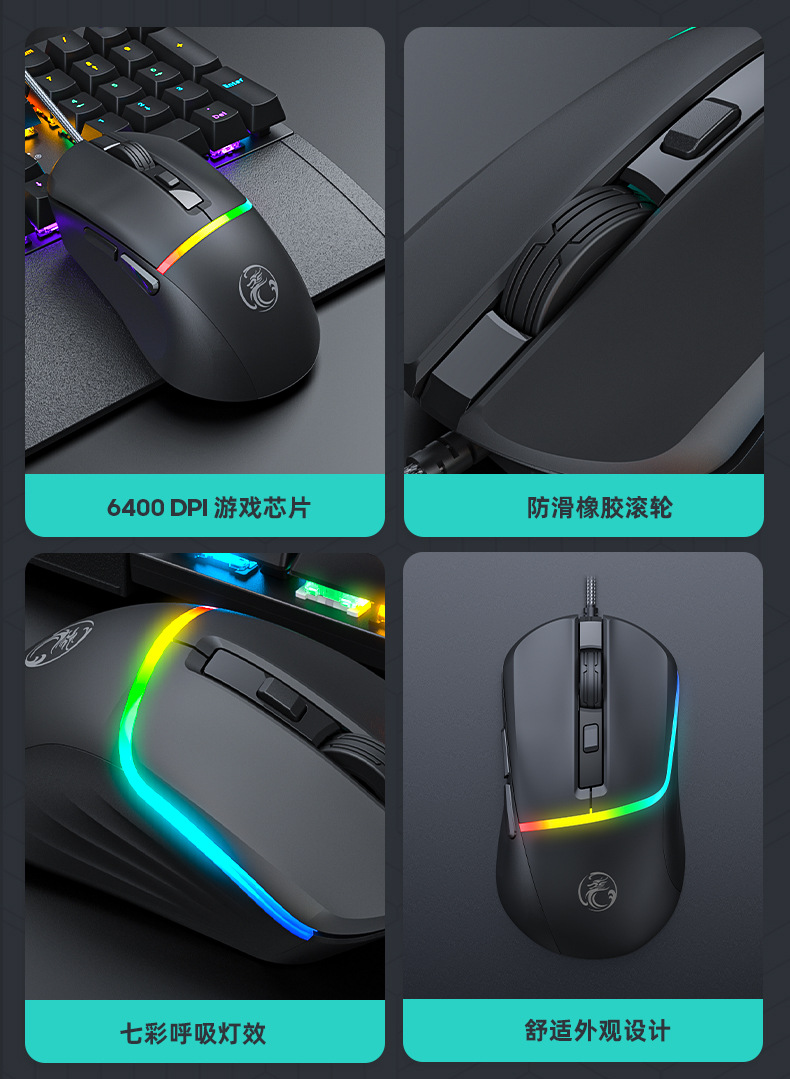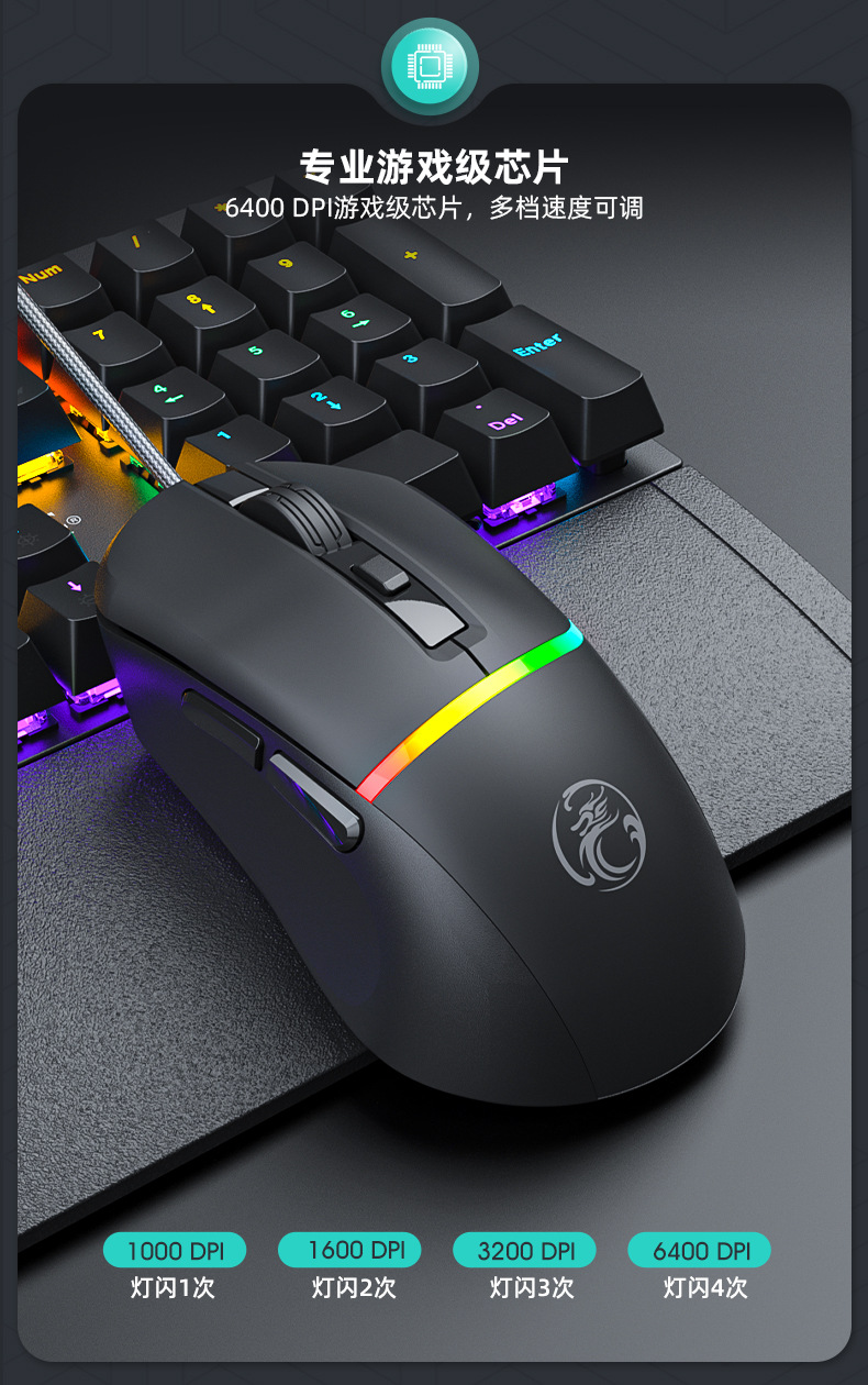 品牌: IMICE 货号: T20 上市时间: 2024.8 类型: 光电鼠标 鼠标大小: 普通鼠(100-120mm) 与电脑连接方式: 有线 适用机型: 台式机 光电分辨率: 6400DPI 按键数: 6 接口: USB 是否支持人体工程学: 支持 分辨率可调: 四档 操作距离: 1.5m 工作方式: 光电 滚轮方向: 四向滚轮 线长: 1.5M 产品尺寸: 115*64*39mm 产品重量: 90 加印LOGO: 可以 售后服务: 店面三包 重量: 0.5 kg/个