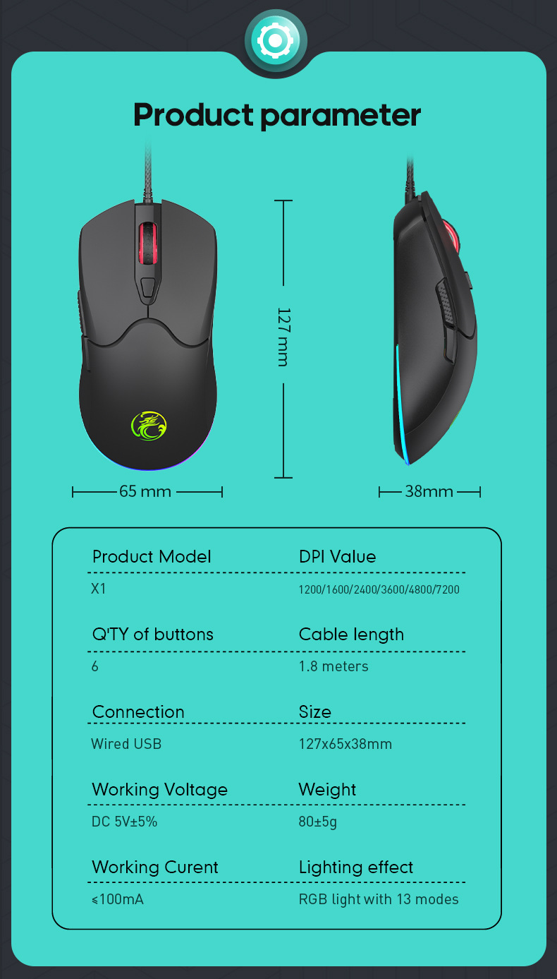 品牌: IMICE 货号: X1 上市时间: 2024 类型: 游戏鼠标 鼠标大小: 普通鼠(100-120mm) 与电脑连接方式: 有线 适用机型: 笔记本电脑 光电分辨率: 7200DPI 按键数: 6 接口: USB 无线传输频率: 2.4GHz 是否支持人体工程学: 支持 分辨率可调: 六档 操作距离: 1.5M 工作方式: 光电 滚轮方向: 四向滚轮 线长: 1.5M 产品尺寸: L132*W70*H42mm 产品重量: 80±5G 加印LOGO: 可以 重量: 0.5 kg/个