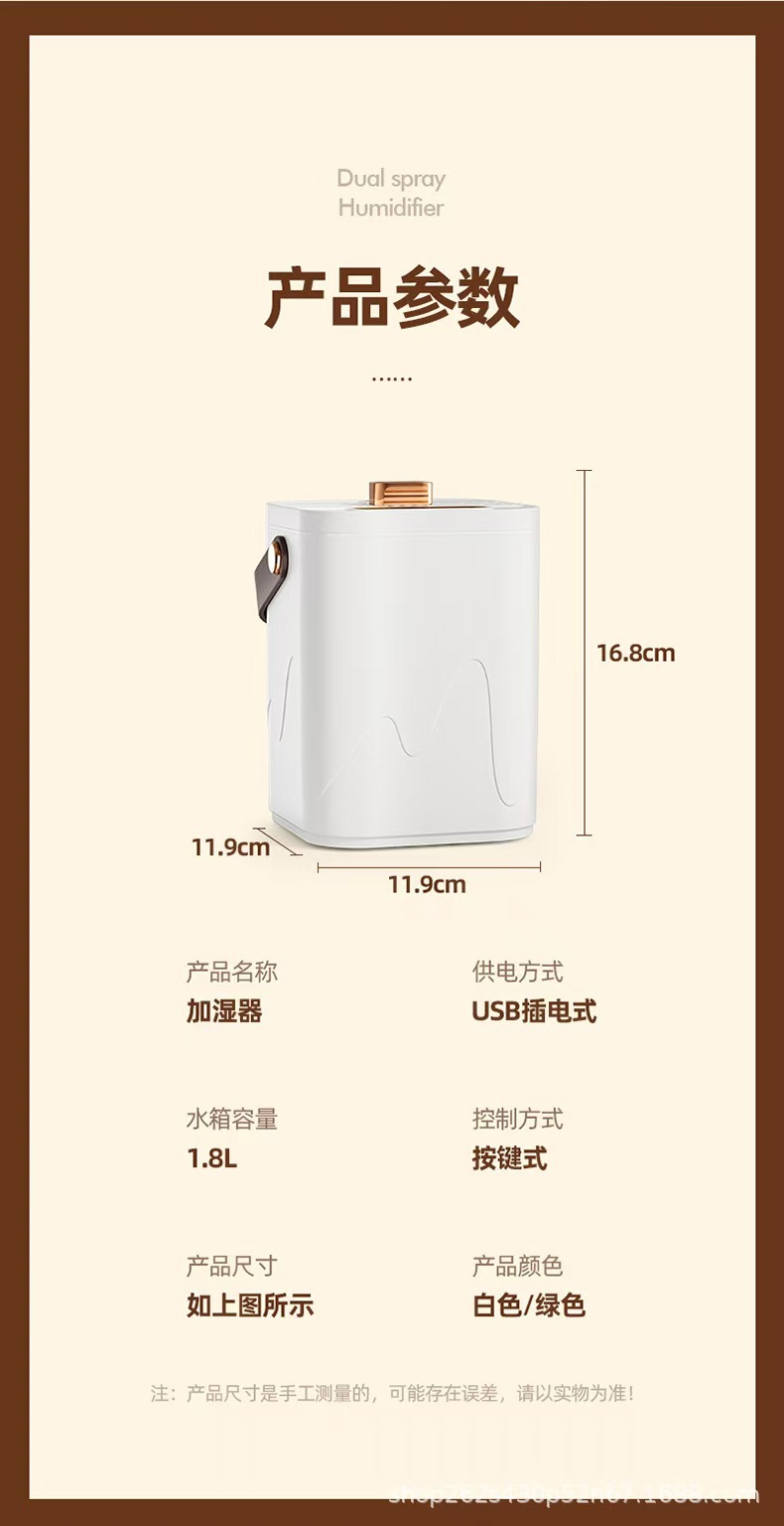 品牌: 其他 型号: JSQ 适用面积: 10-20平米 水箱容量: 1.0-2.5升 适用对象: 家用 货号: JSQ01 功能: 香薰 出雾口数: 2个 操作方式: 机械式 缺水断电保护: 支持 电源方式: USB 外形: 方型 噪音: 36-45db 额定电压: ≤36V 颜色: 白色,绿色 产品规格: JSQ01 有可授权的自有品牌: 否 是否跨境出口专供货源: 是 是否专利货源: 否 材质: 塑料 重量: 0.5 kg/件