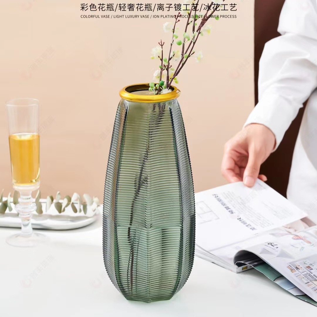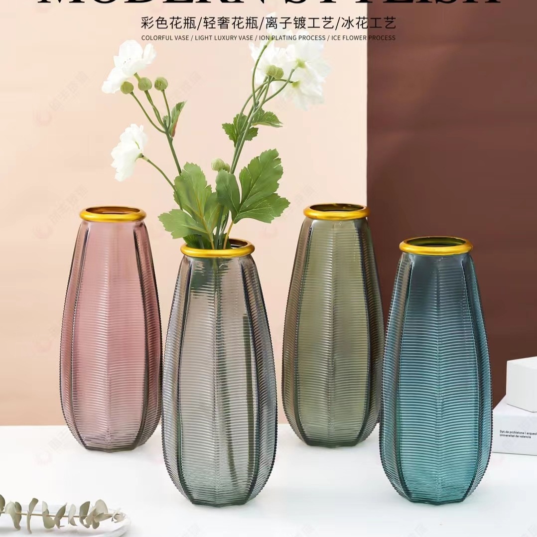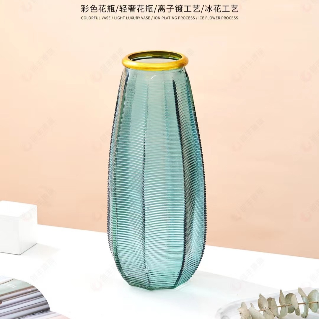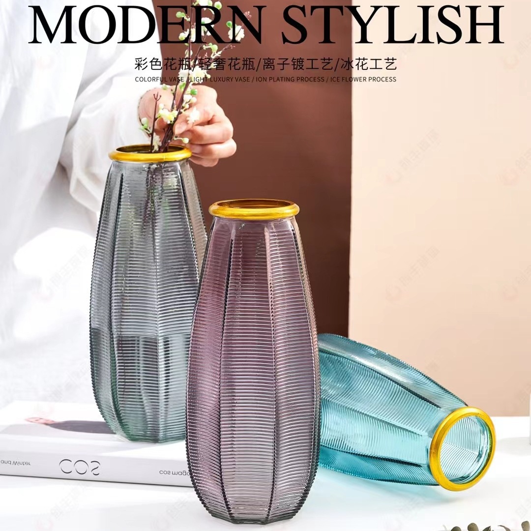 2147描金玻璃花瓶彩色轻奢离子镀并列工艺鲜花插花装饰丝带花瓶 English | 投诉