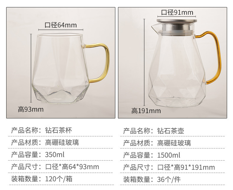 产品类别: 茶具套装 是否进口: 否 货号: 茶壶套装 材质: 高硼硅 规格: 锤纹茶具套装,钻石茶具套装 产地: 潮州 加印LOGO: 可以 加工定制: 是 产品上市时间: .. 是否有专利: 否