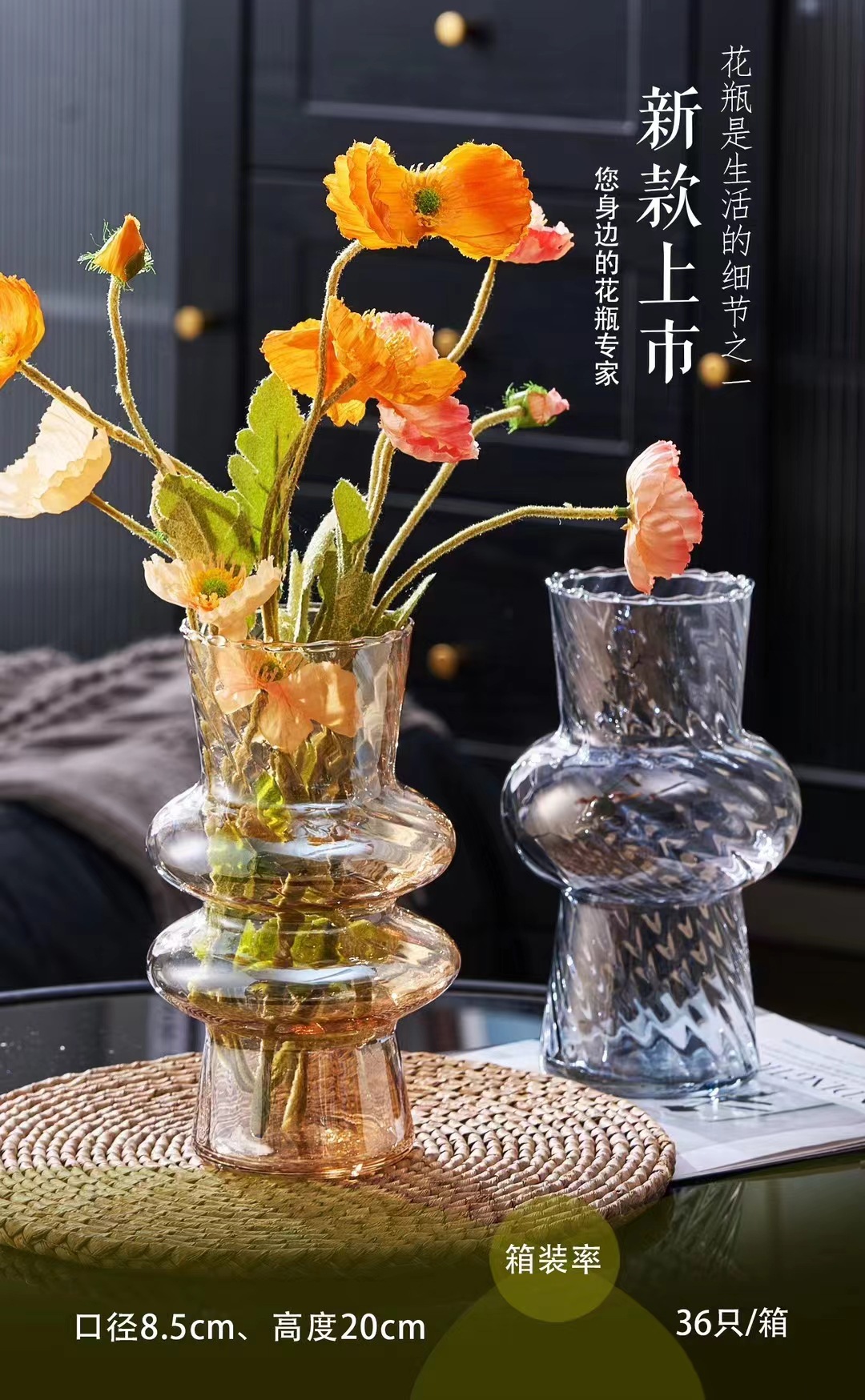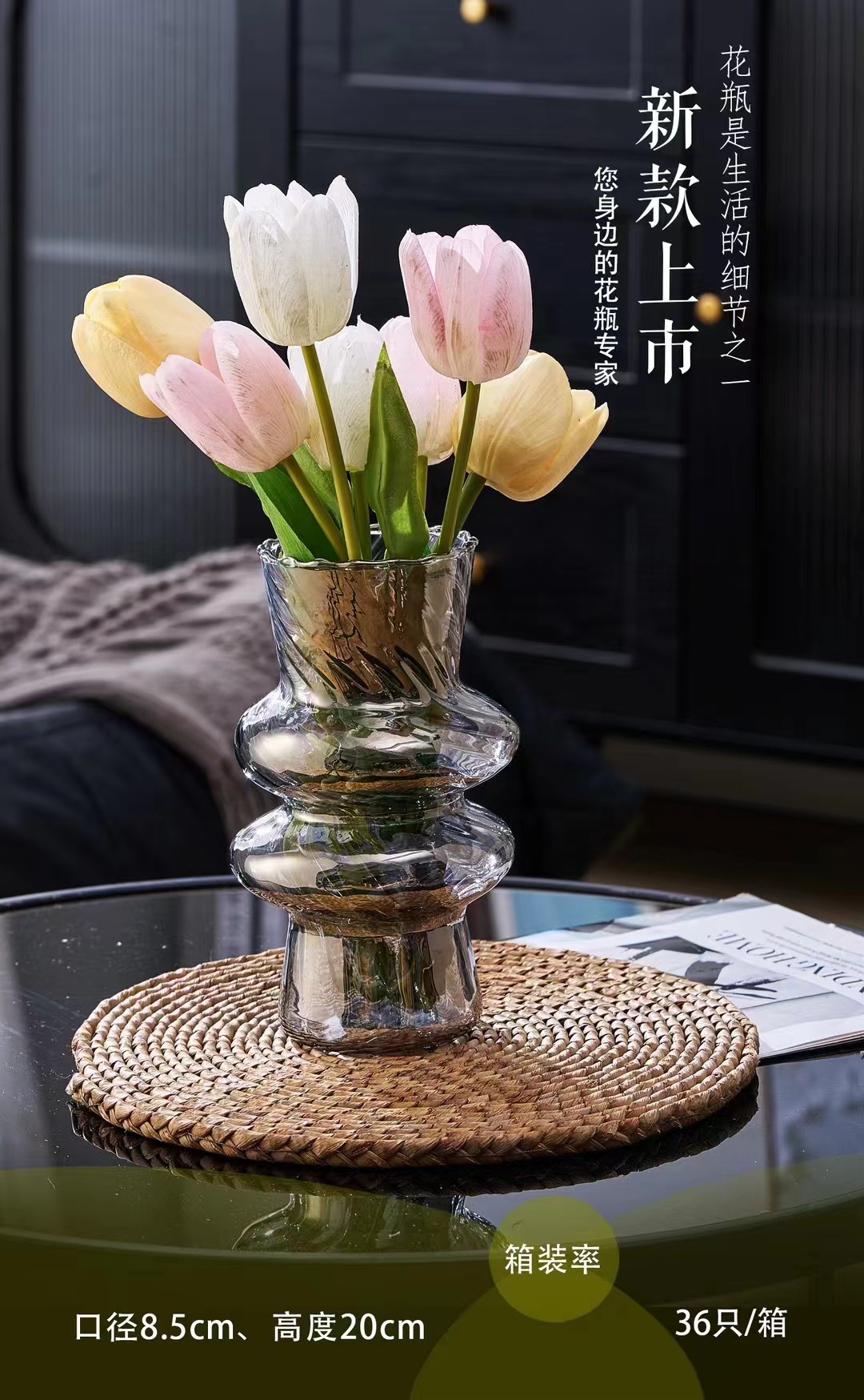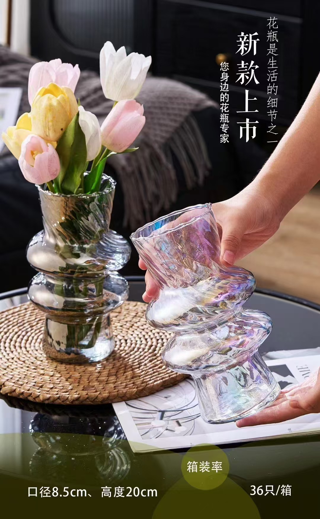 厂家直销新款玻璃扭纹花瓶书桌客堂办公室插花桌面装饰现代简约彩 English | 投诉